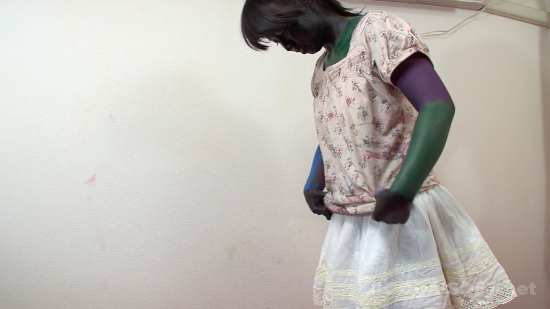カラフルなドーランの色数が少ない為、全部分違う色には出来ませんでしたが、COCOA SOFTらしく、いきなりの黒色での顔塗りから始め、顔が真っ黒の状態で、全身が徐々に色々な色に染まり、最後は電マでオナニーを・・・