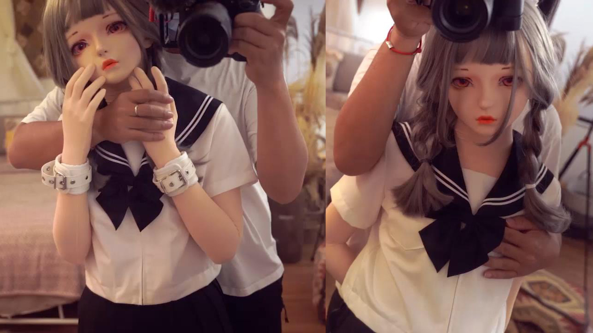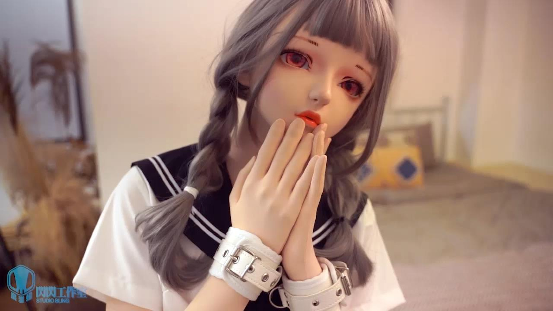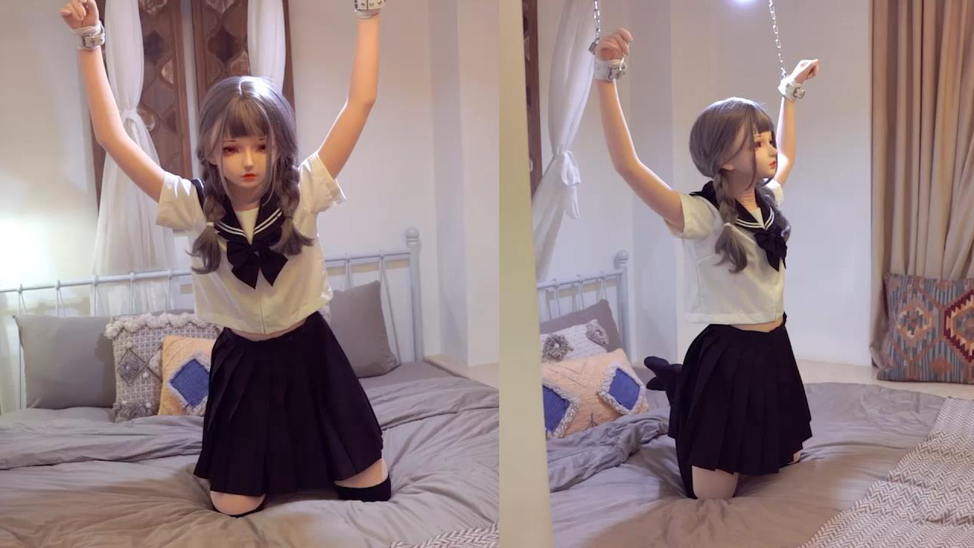 本題に入り、人形の両足を折りたたみ、拘束ベルトで固定し、両手を吊り上げます。
