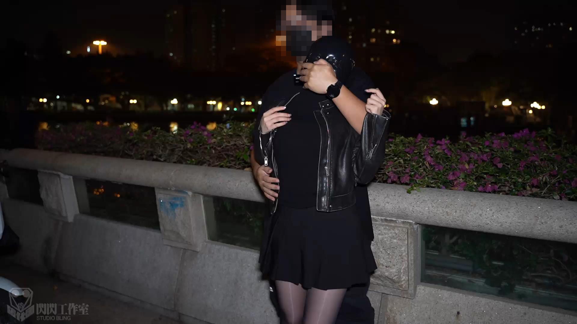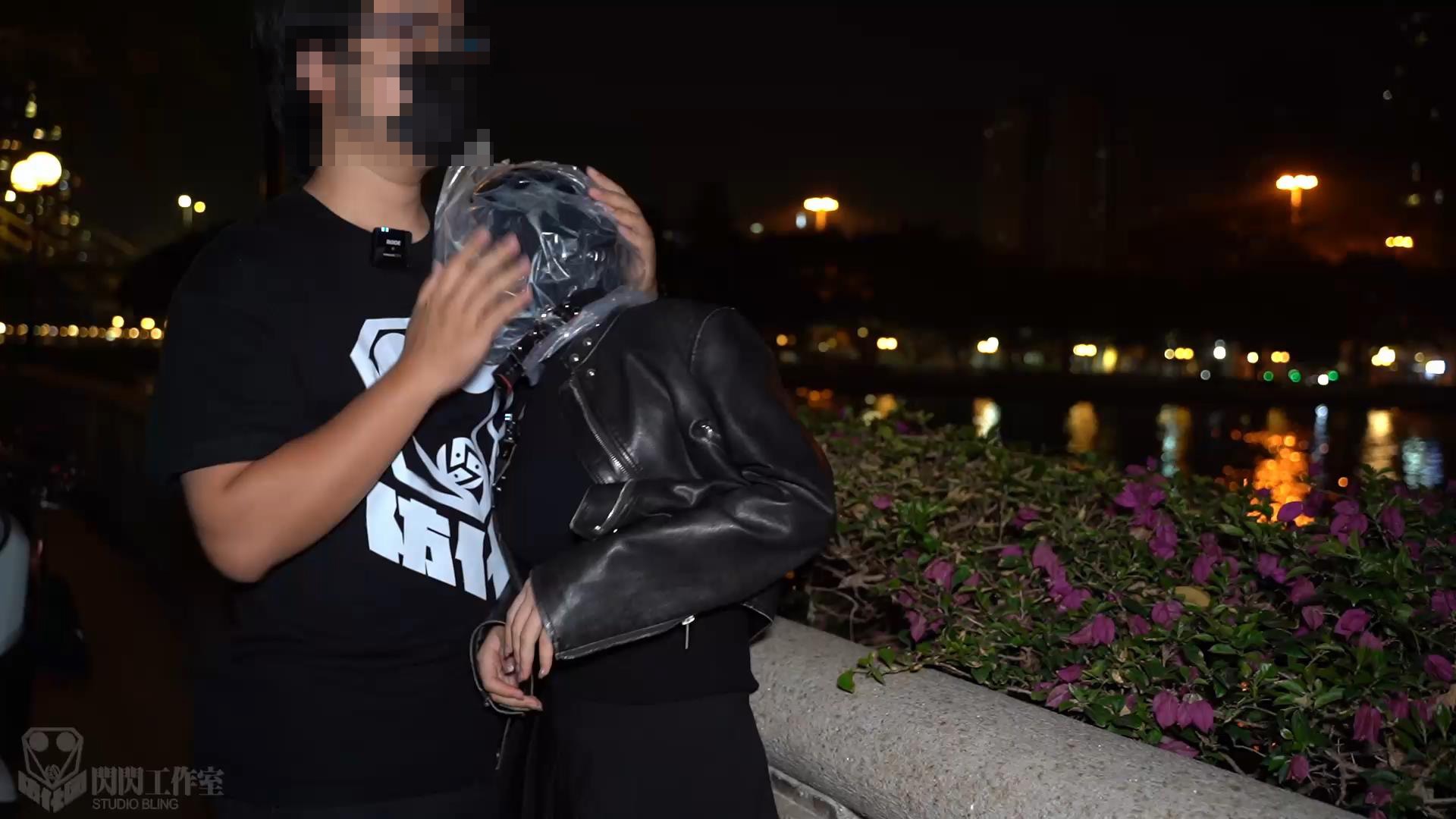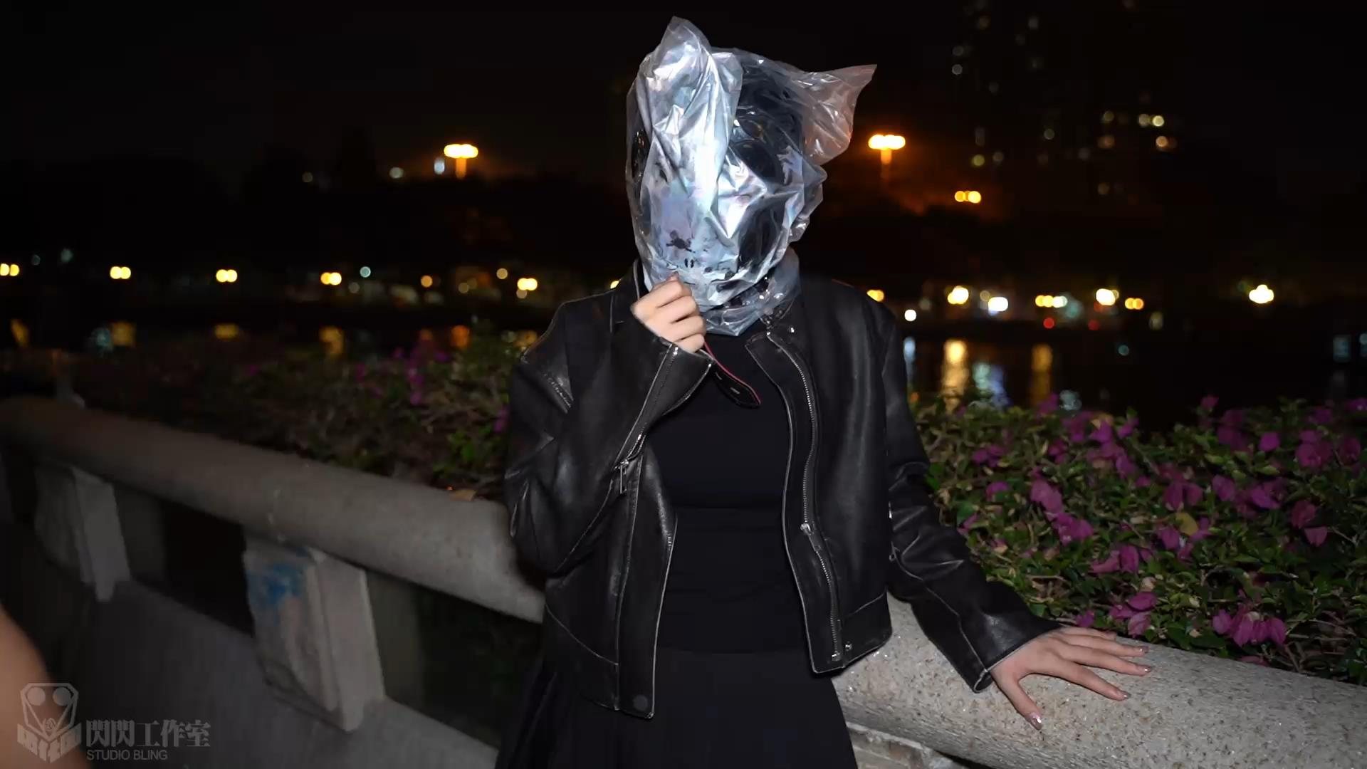そこでビニール袋を黒ゴムのヘッドカバーにかぶせ始めました。ヘッドカバーのゴムとビニール袋の材質は癒着し、袋の多くの位置がヘッドカバーにくっつき、呼吸空間を大幅に減らしました。袋はすぐにTOKIMEの呼吸で霧が出て、私も手持ちのカメラで彼女の初めての屋外の呼吸制御ゲームを記録し始めました