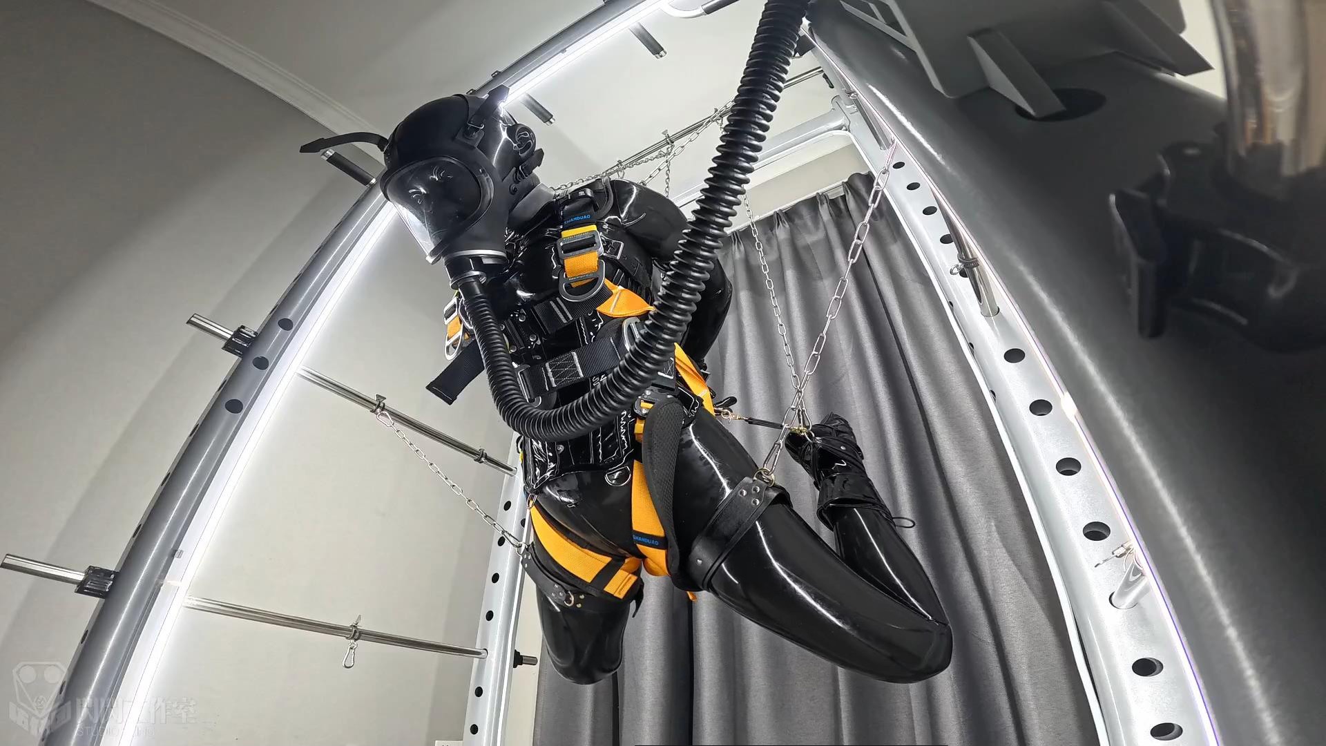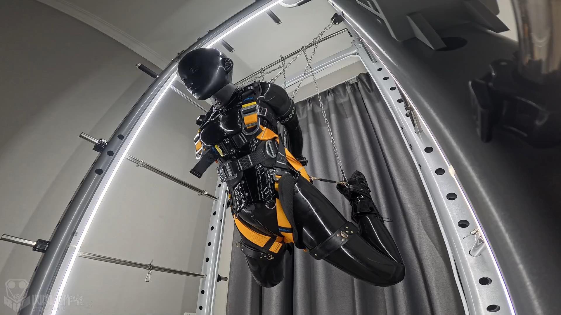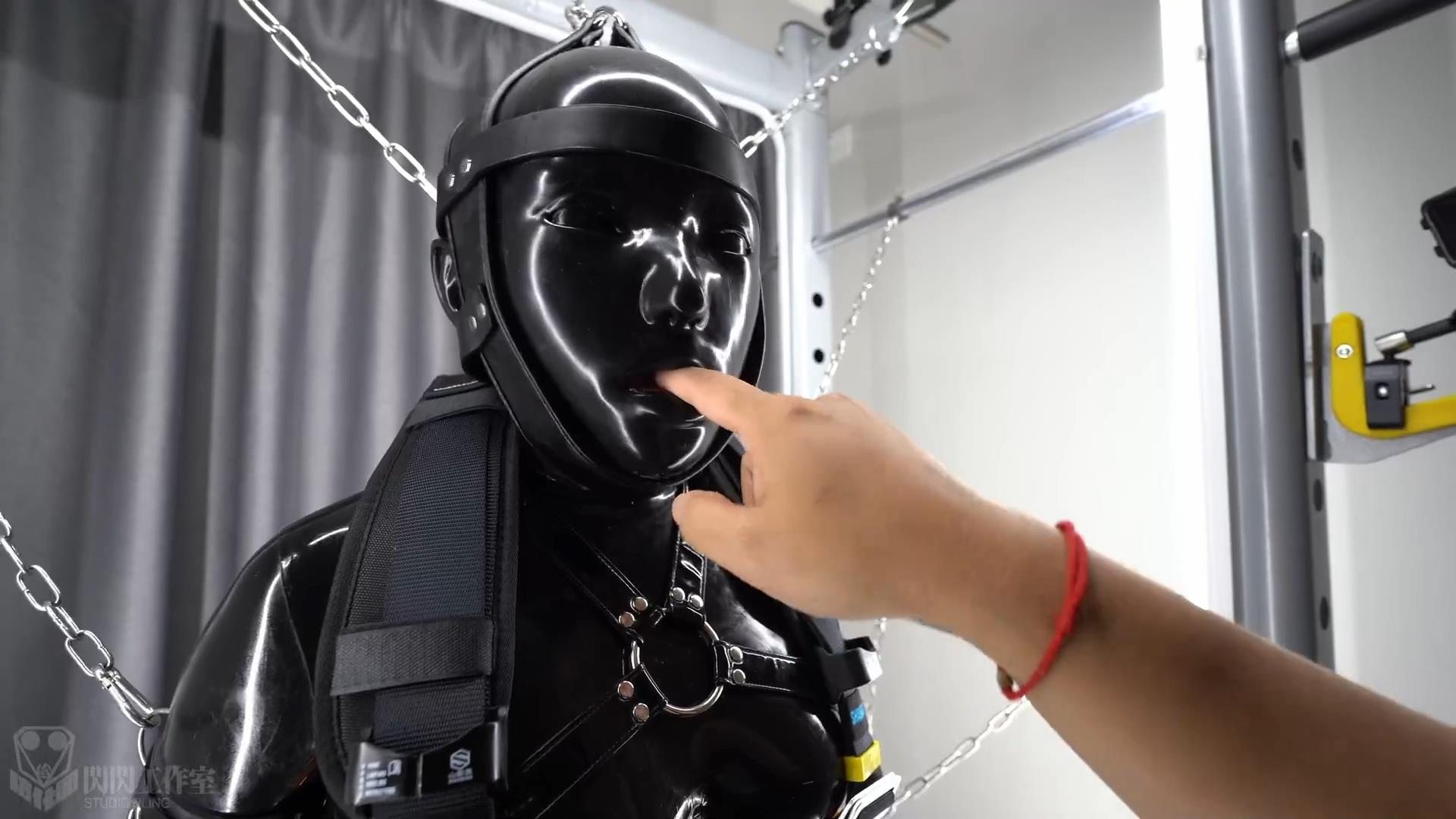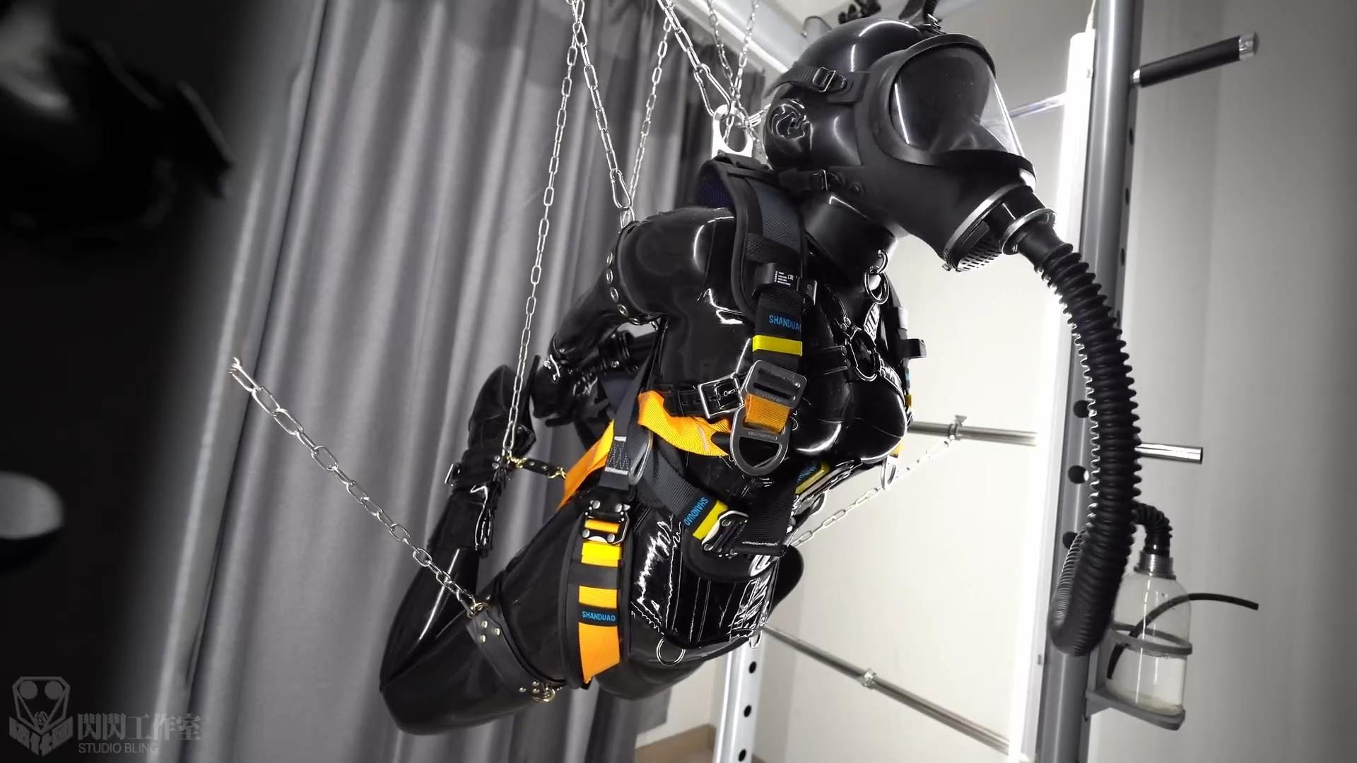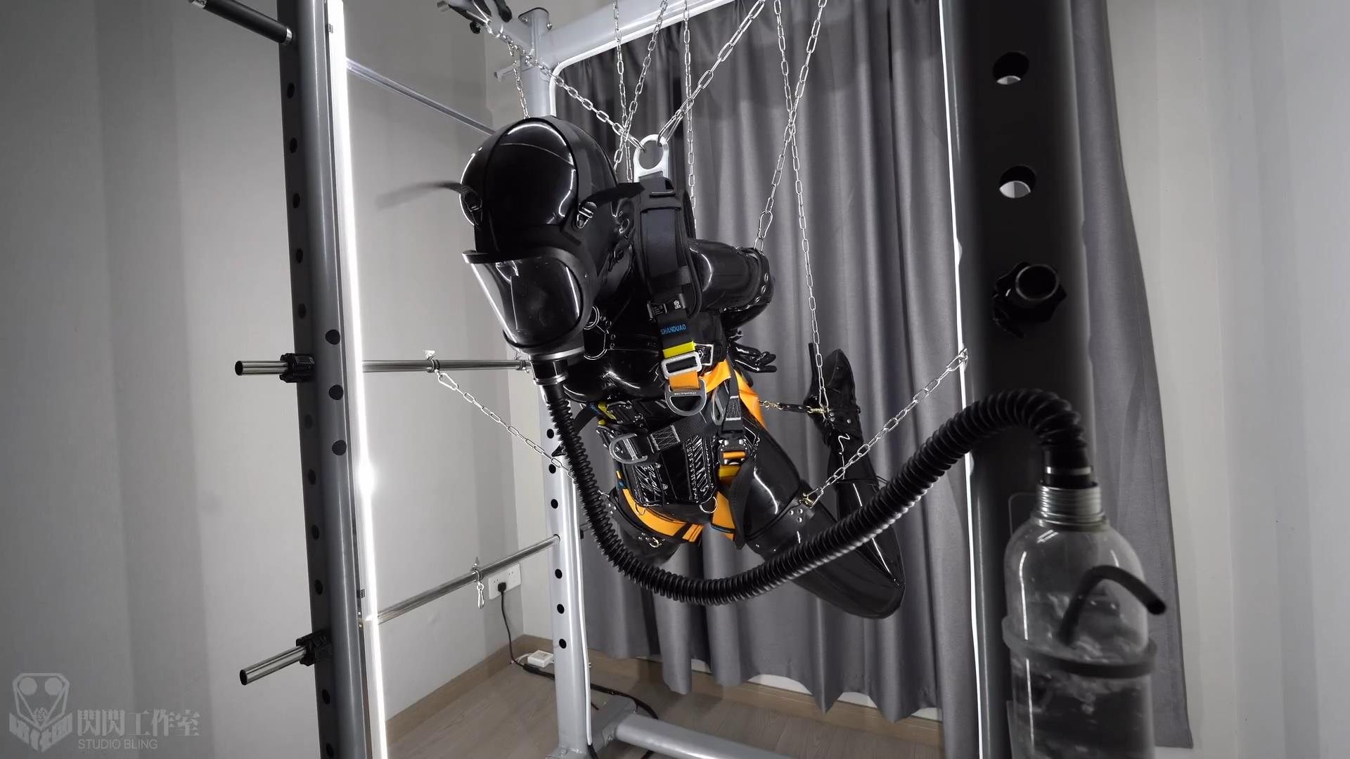 次はサスペンションモードで、バレエブーツに足の手錠を加え、足を折って足の手錠を腰の掛金につなぎ、さらに足を鎖で持ち上げ、両手の後ろに腕を上げ、首輪も後ろに引っ張る