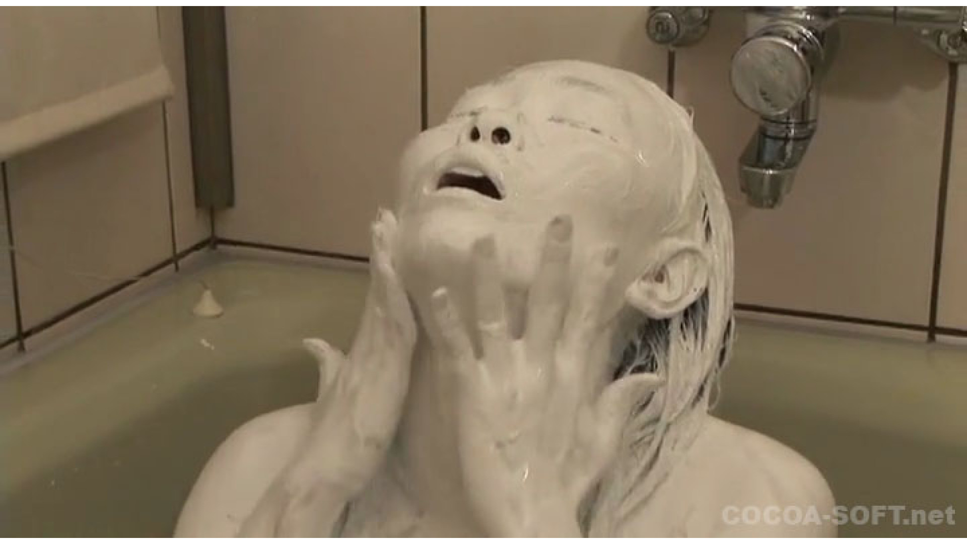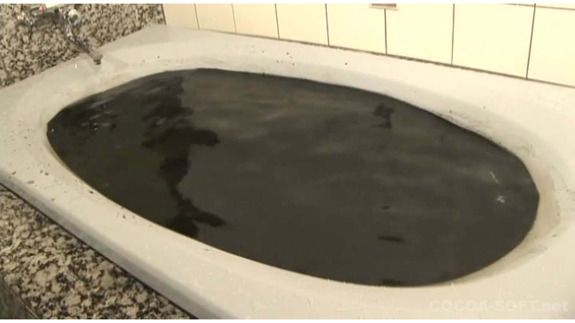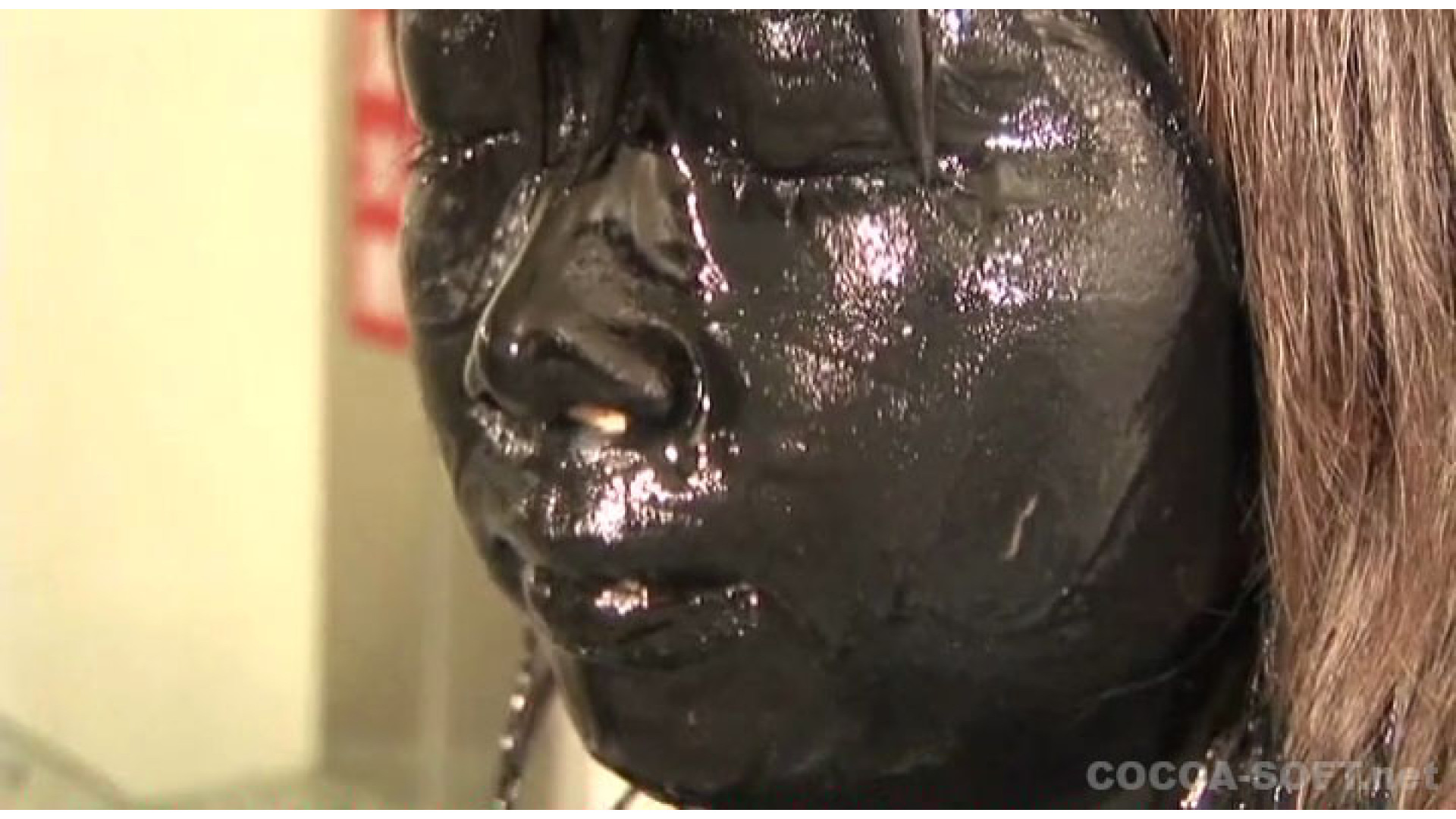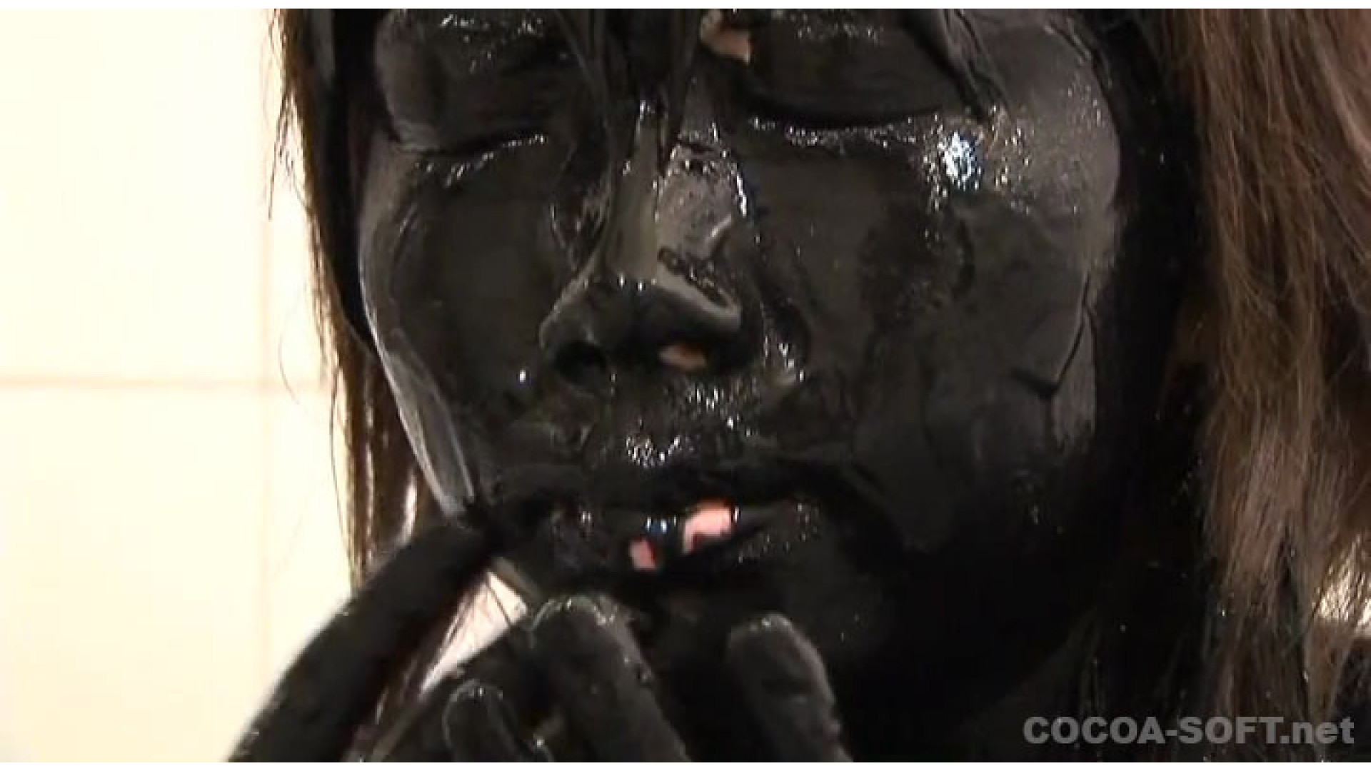 黒色の絵の具を、顔からかけ、その後全身真っ黒になり、最後はシャワーで絵の具を洗い流すが 絵の具はそのまま溜めて置き、その絵の具の中に潜ってしまいます。
