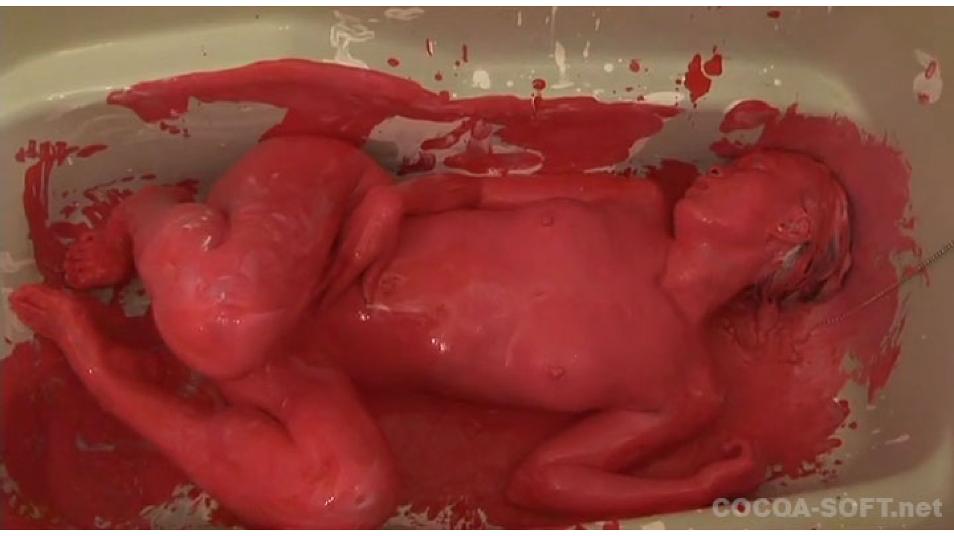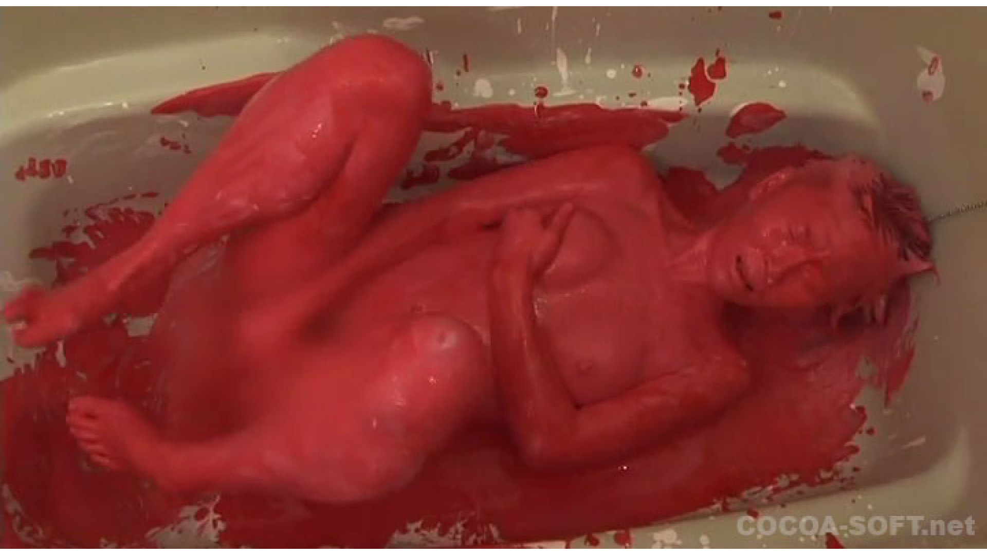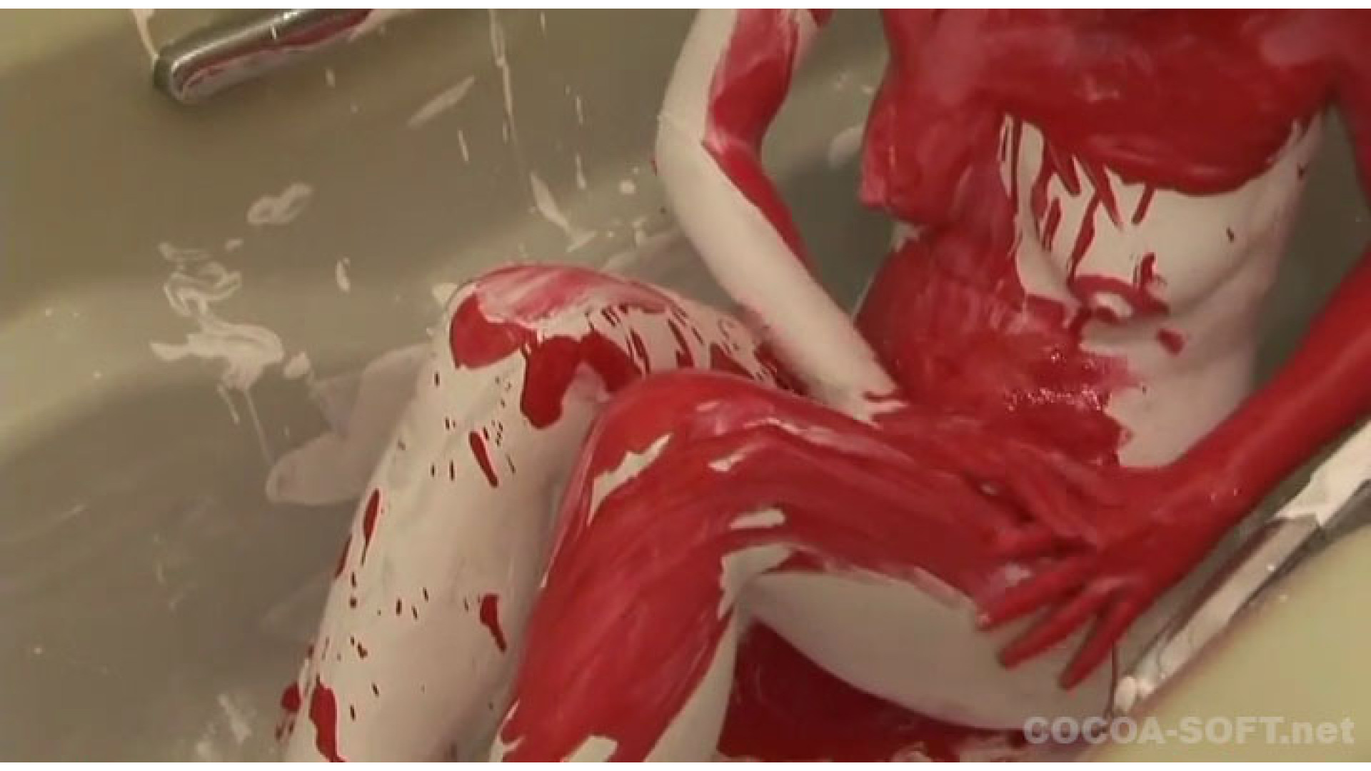 続いてのシーンは、白色の絵の具の後、赤色の絵の具を混ぜ、全身がドロドロ状態で、オナニーを!!