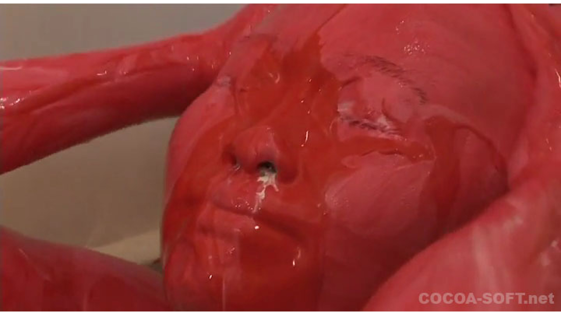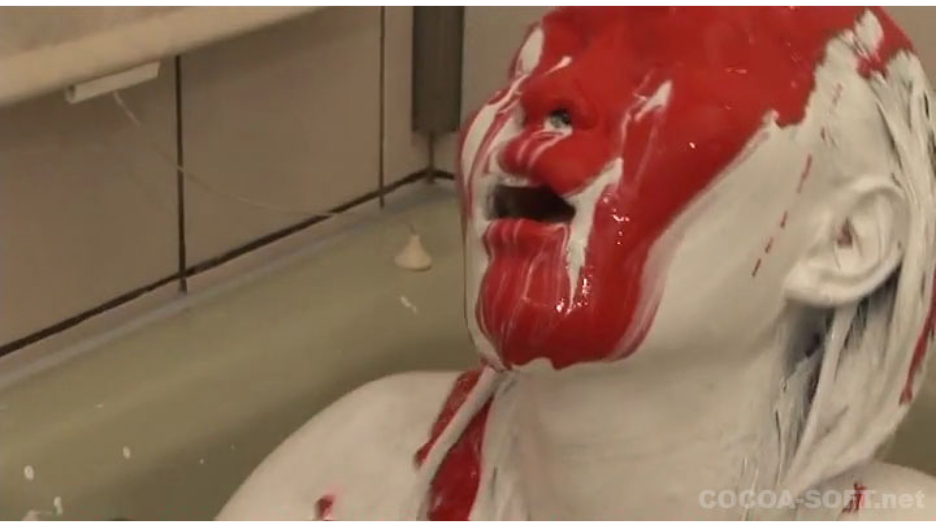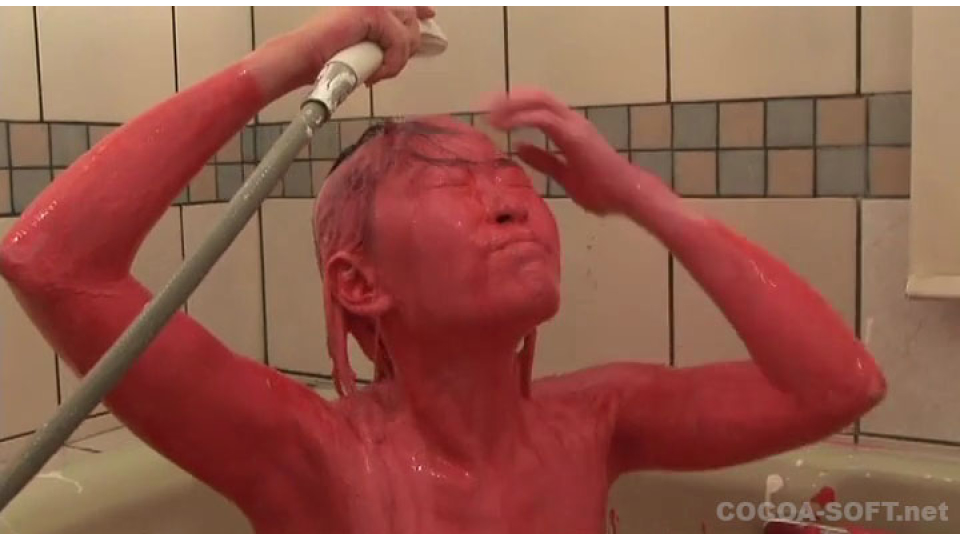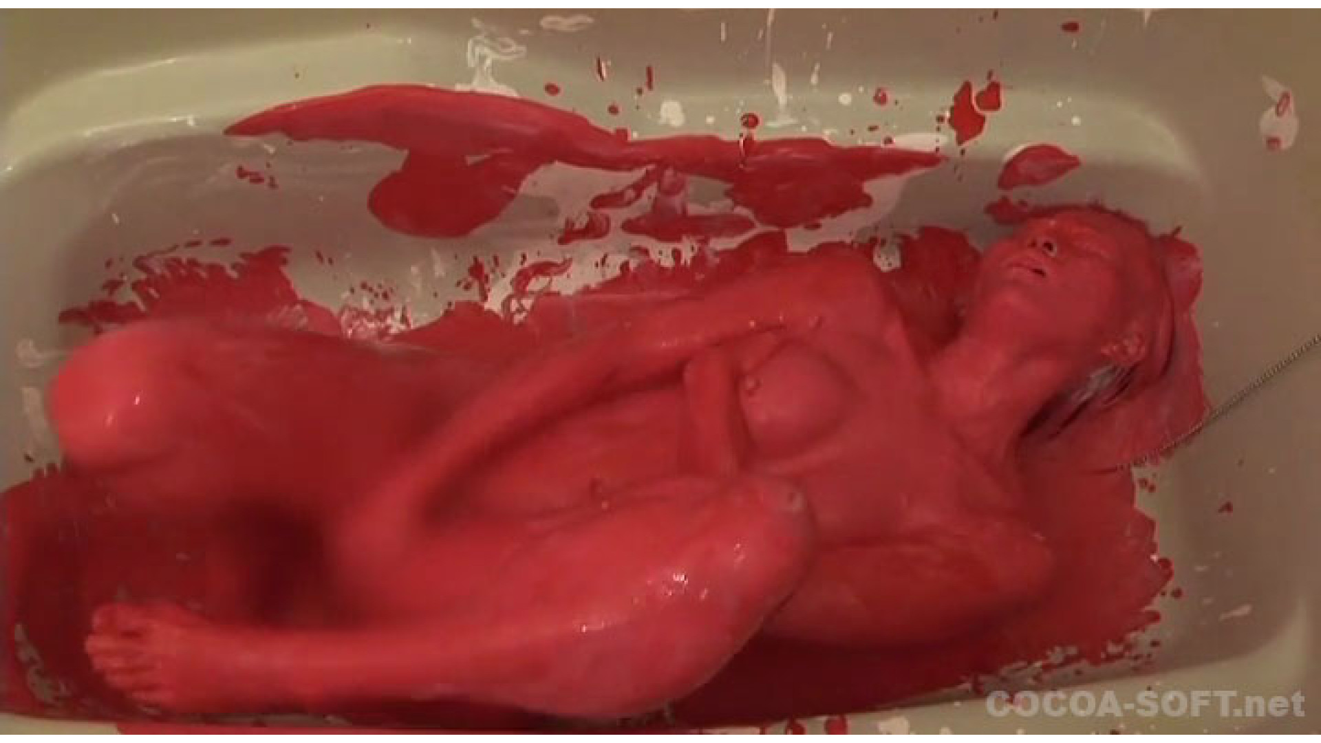 続いてのシーンは、白色の絵の具の後、赤色の絵の具を混ぜ、全身がドロドロ状態で、オナニーを!!