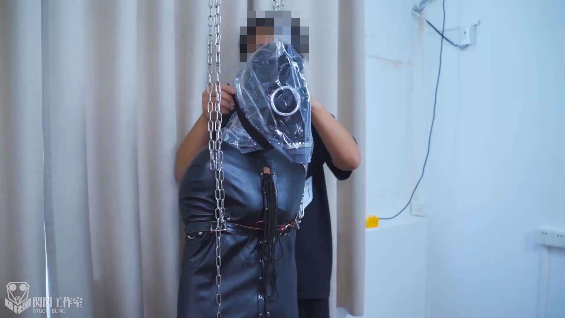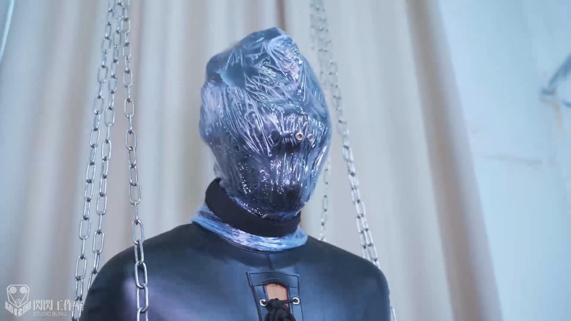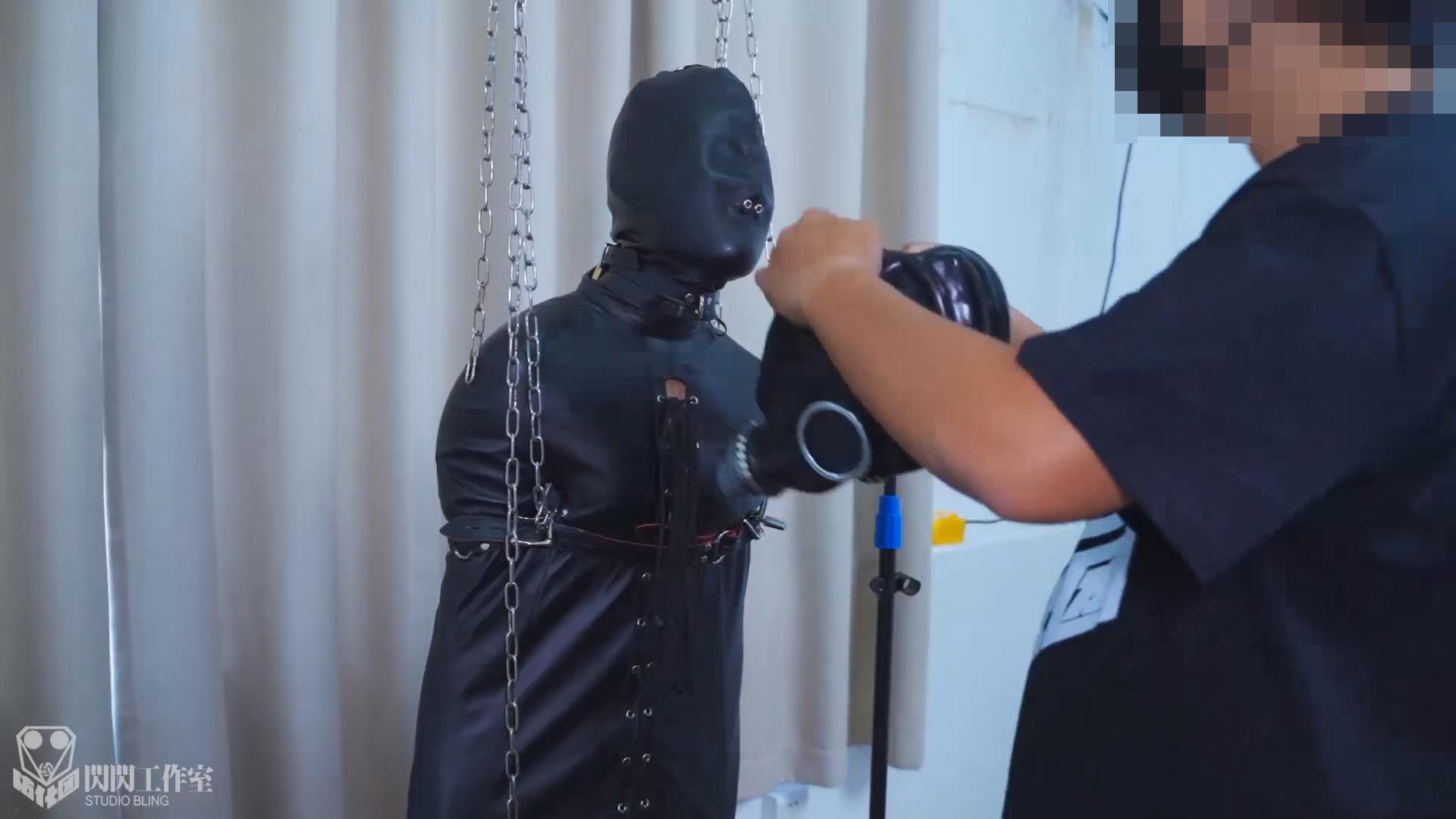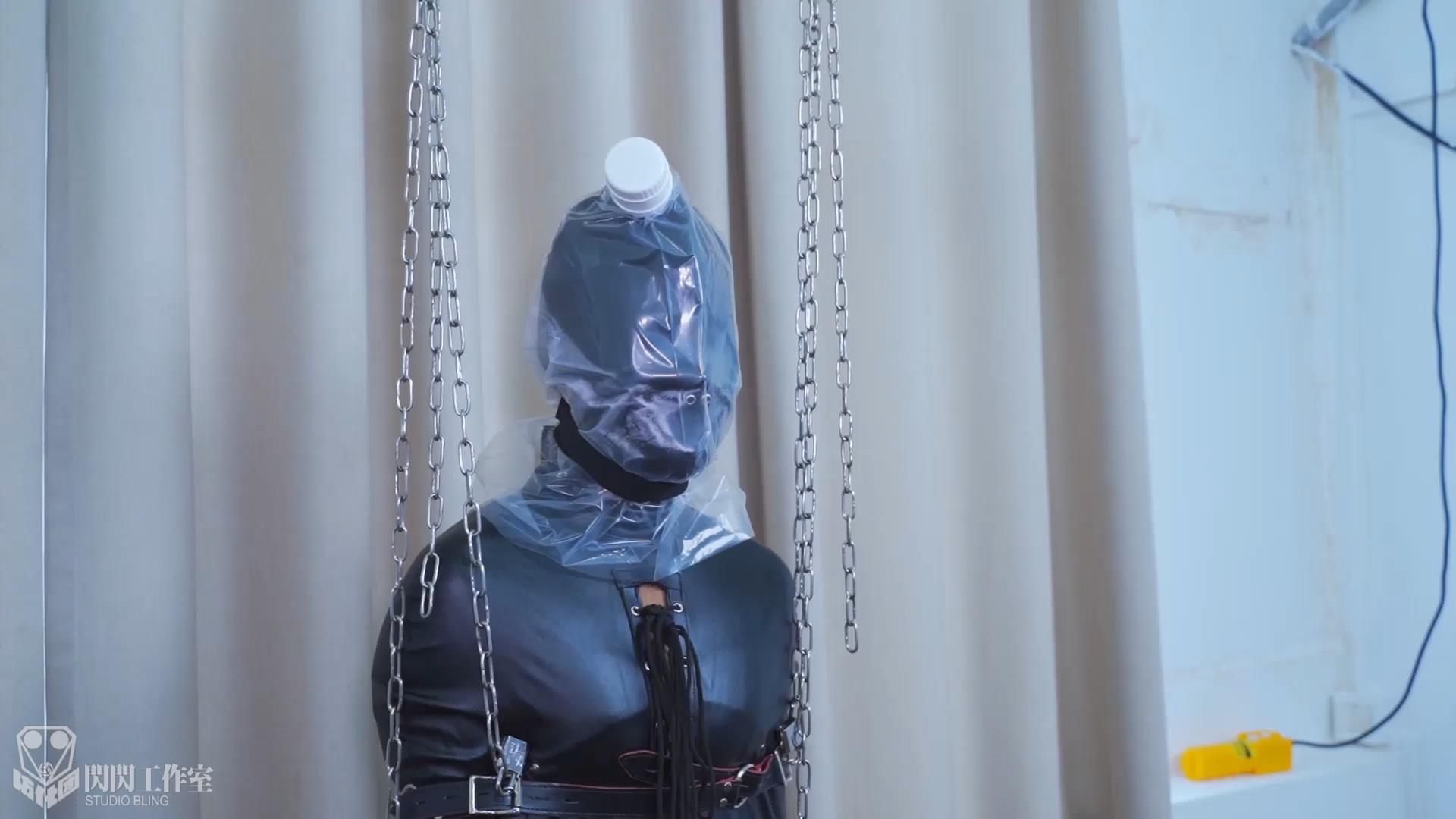 私はヘッドカバーの針掛けと寝袋のファスナーを鎖でつなぎ、KOKOの胸と太ももをいくつかの拘束バンドリングで縛って、鉄の鎖をかけてスタンドにぶら下げた