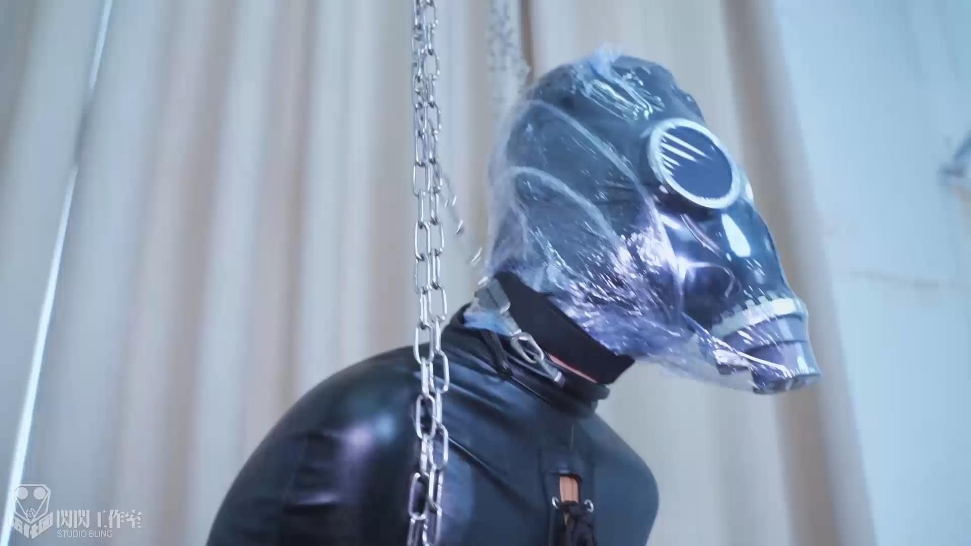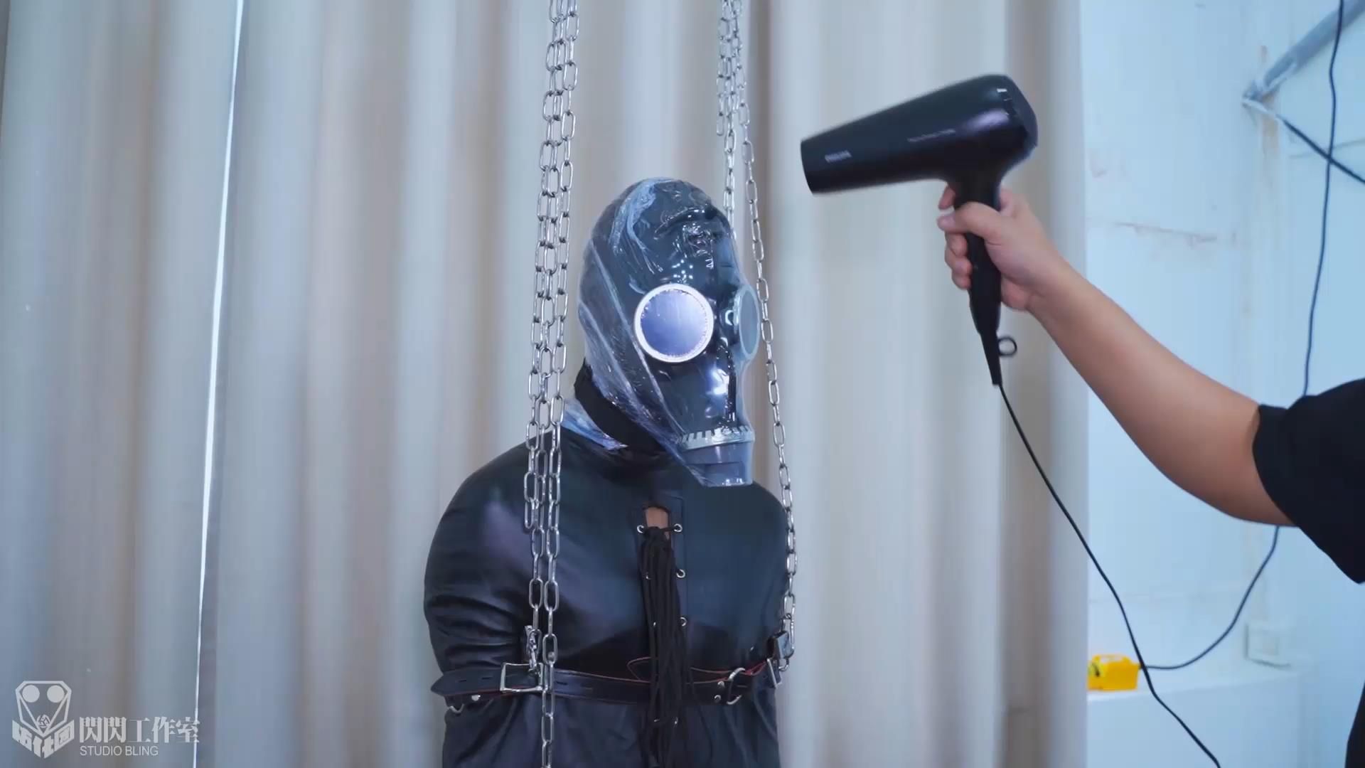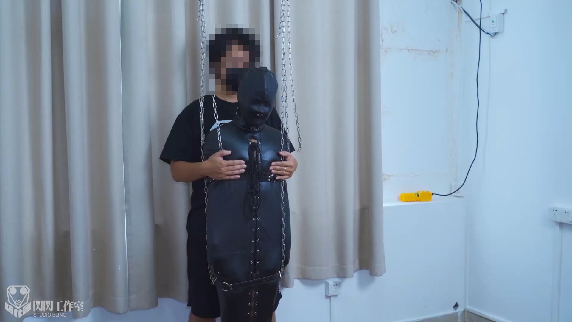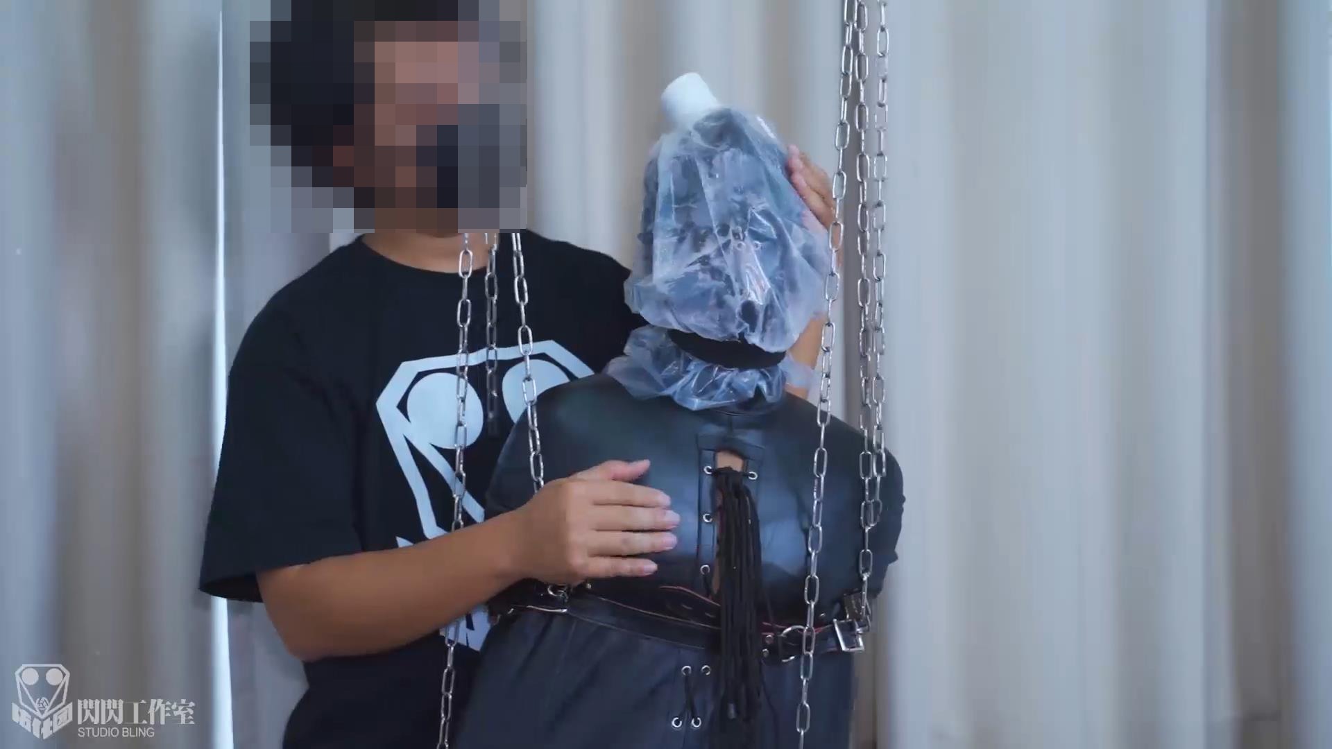 私はヘッドカバーの針掛けと寝袋のファスナーを鎖でつなぎ、KOKOの胸と太ももをいくつかの拘束バンドリングで縛って、鉄の鎖をかけてスタンドにぶら下げた