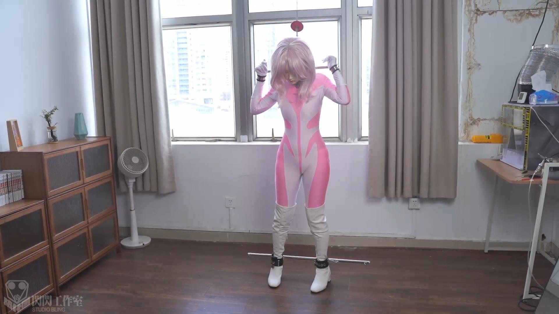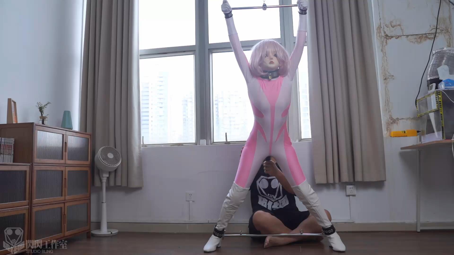 時雨戦士の両手をアイアンで固定し、クレーンで引っ張って微弔り