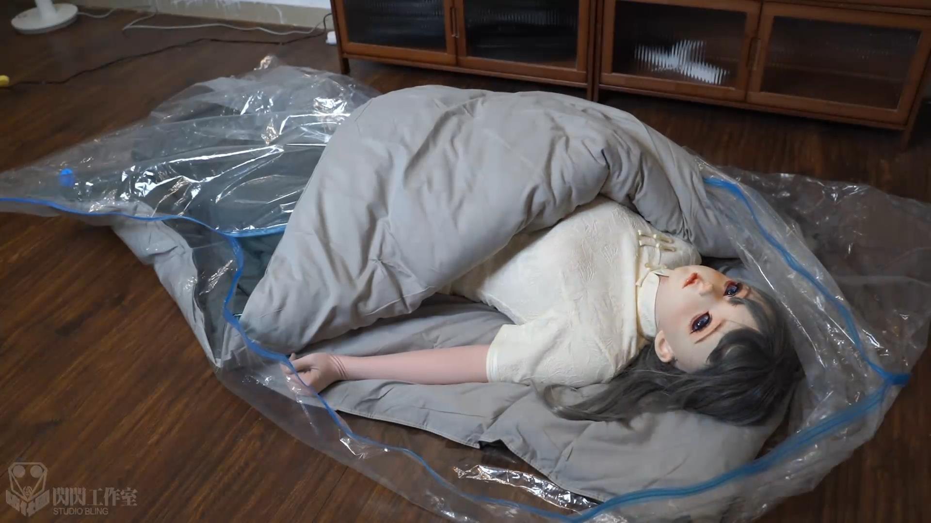 布団を彼女の体に巻きつけた後、ベルトをしっかり締めて、柱に縛られますか。柱を真空袋に入れて空気を抜く