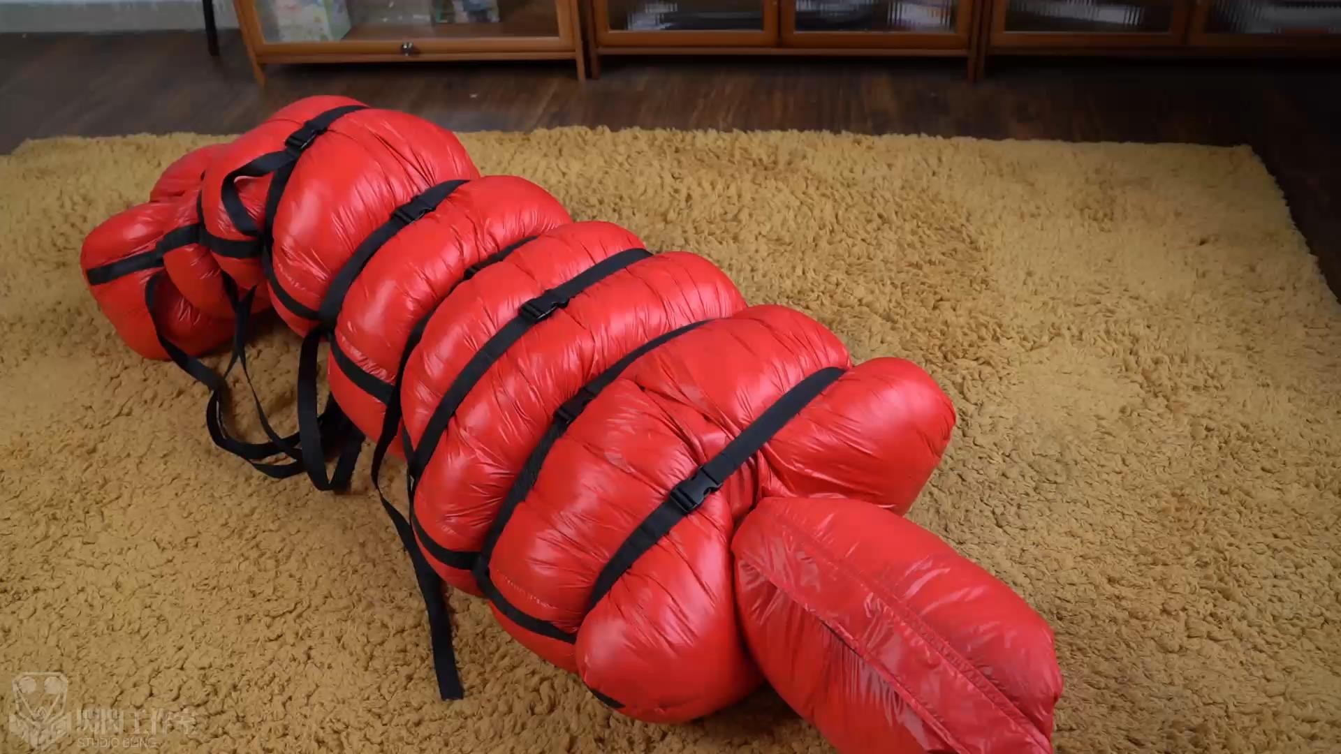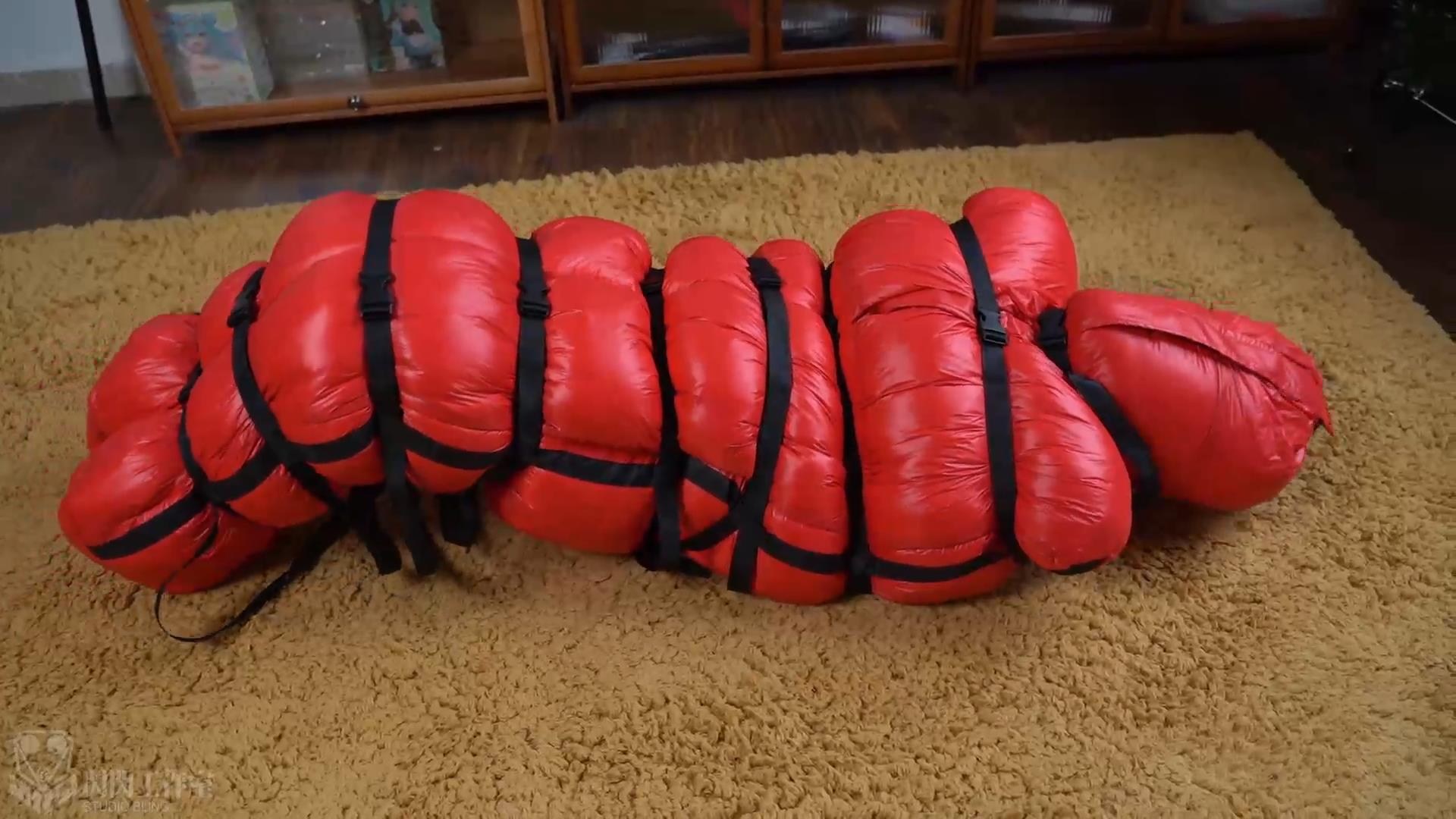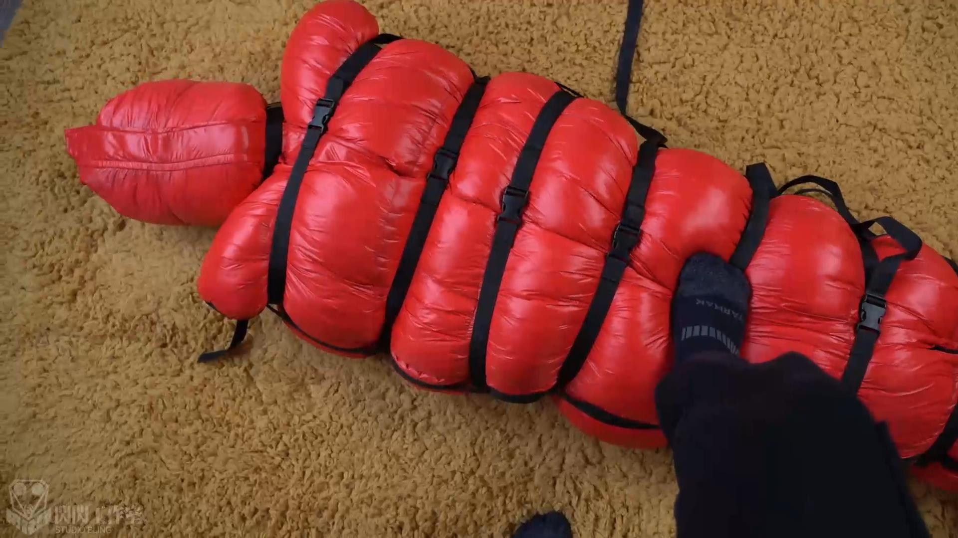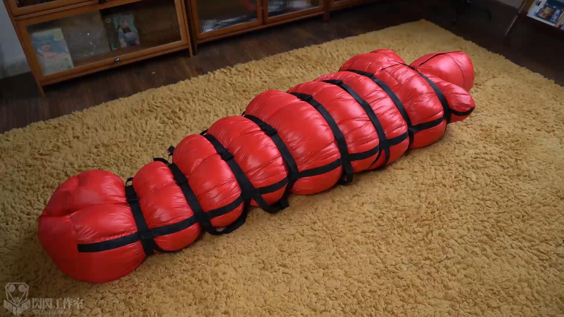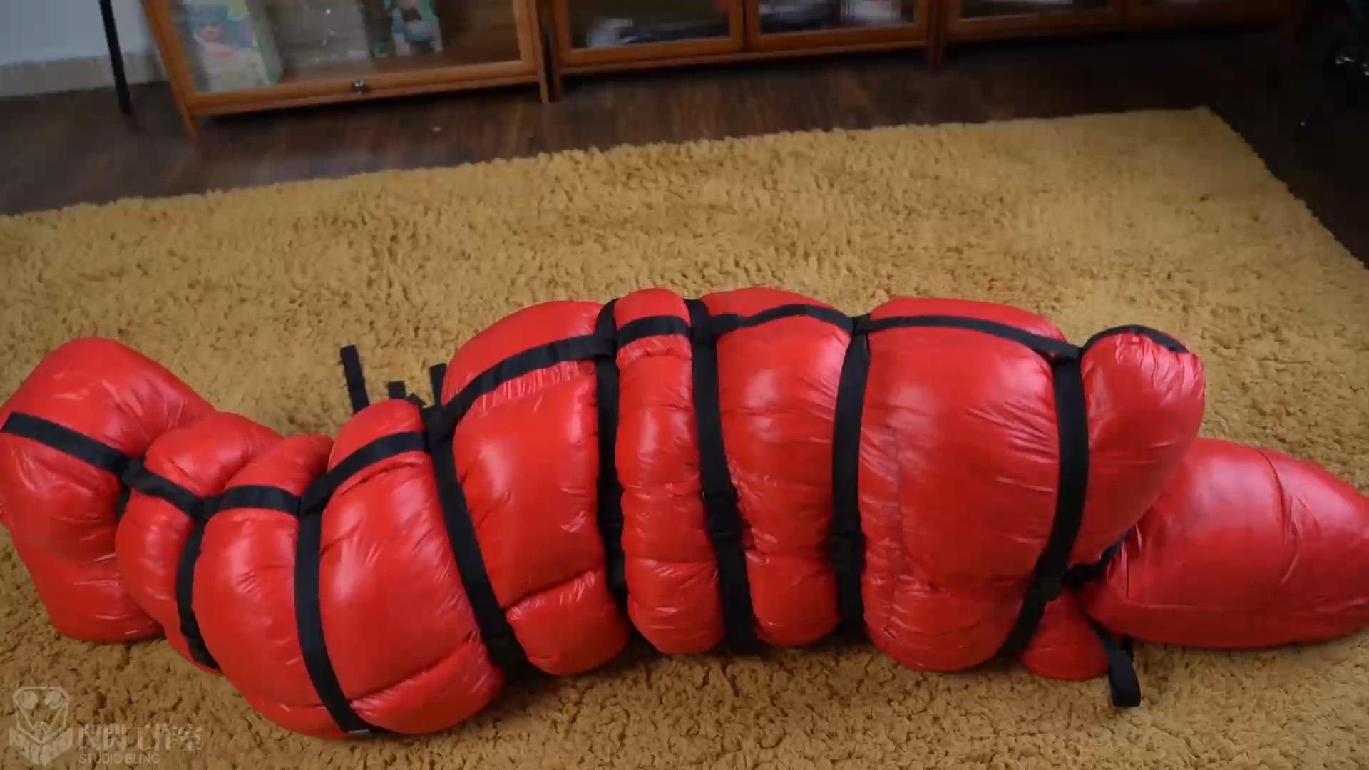 複数の拘束帯が人体の形を描き出し、押し出されたダウンがゆっくりとした拘束感を表現している