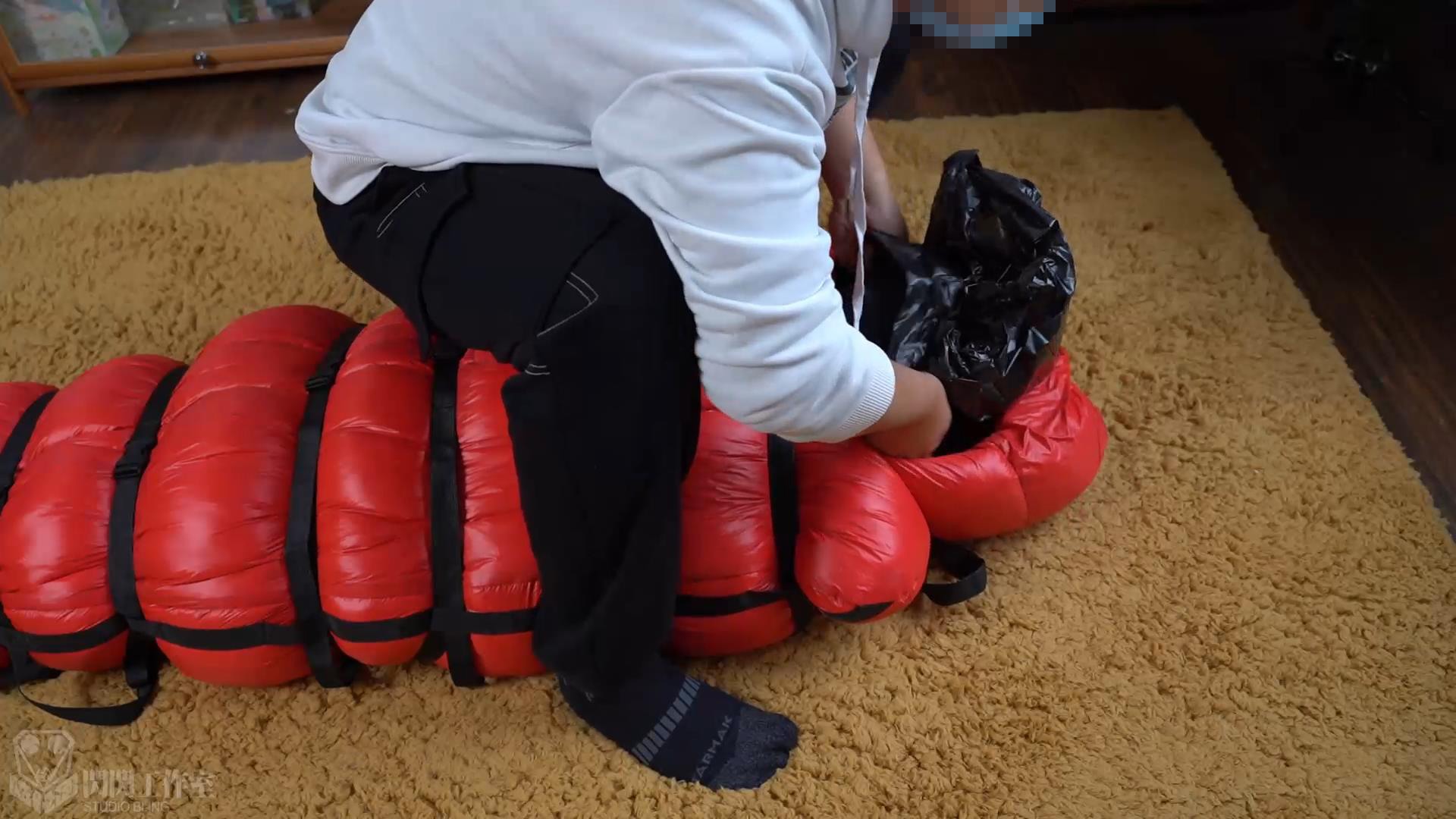 比較的薄いプラスチックごみ袋を持って、寝袋の頭を開けて、TOKIMEの黒い頭にかぶせて、締めます