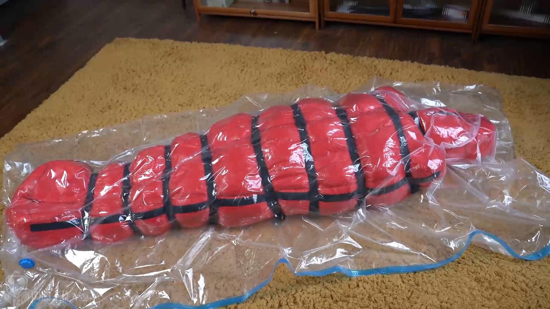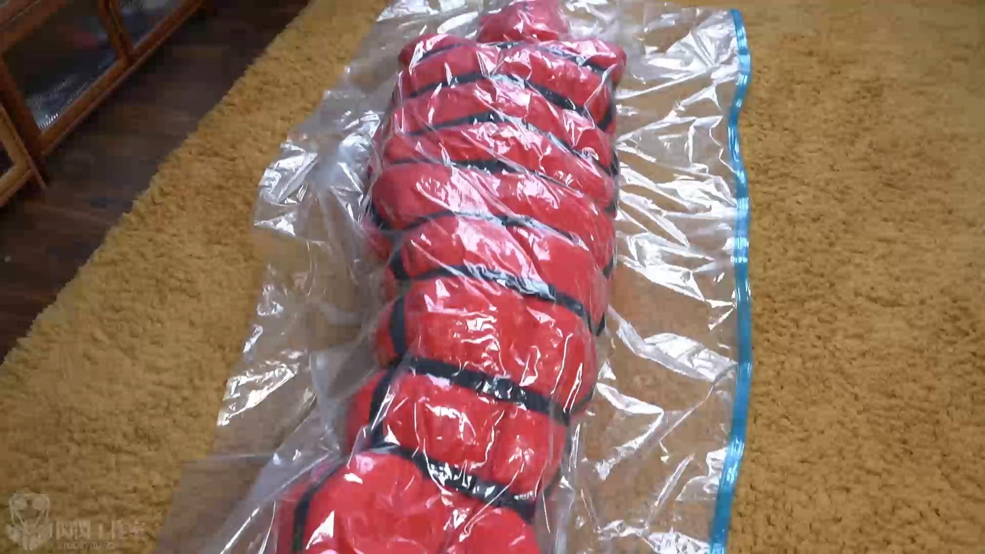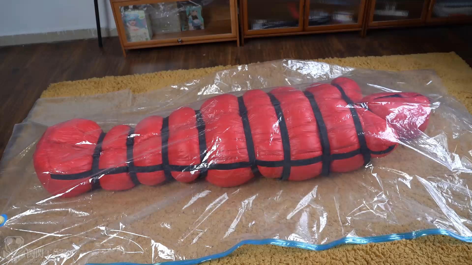 真空袋の中の空気が少しずつ吸い取られ、押し出された寝袋は元の膨張感が少なく、中に充填物が入っているため、大きな圧縮はできない