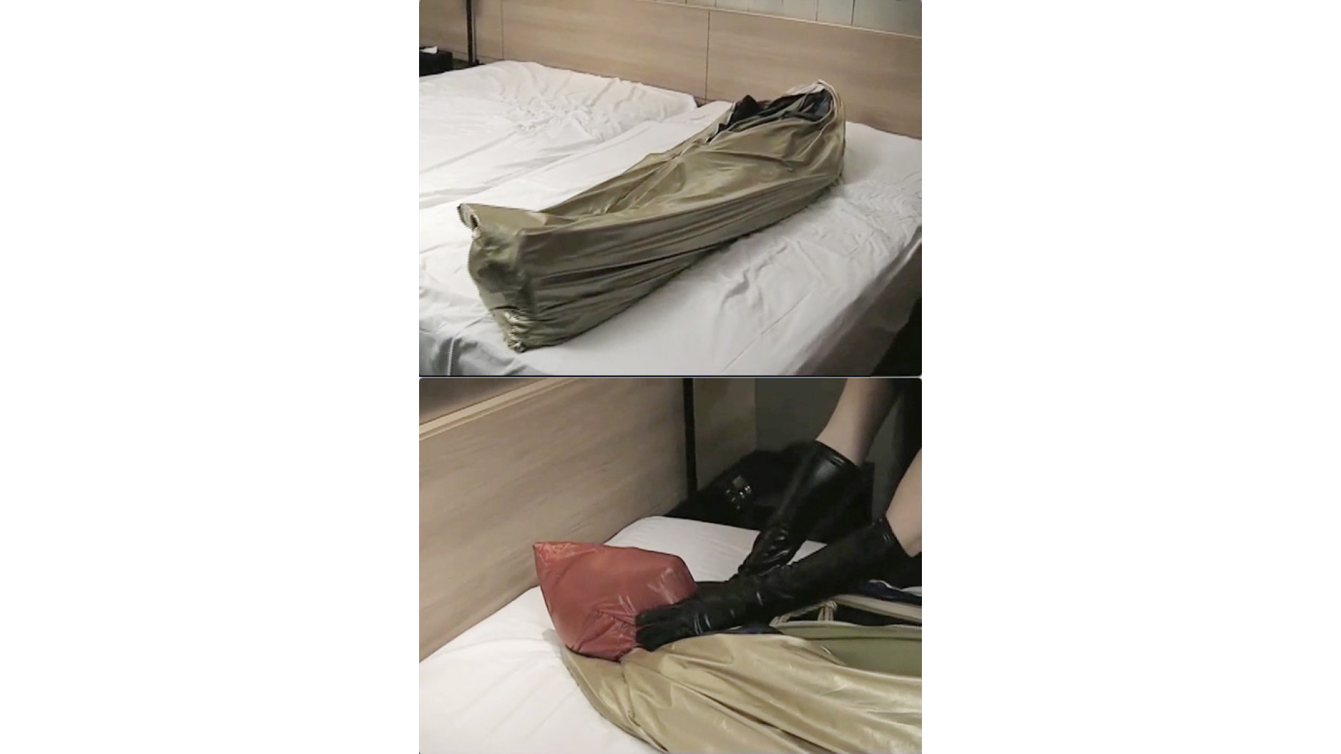 ゼンタイ姿で拘束された男が、ナイロンの袋を顔に被せられ、さらにエナメルや合皮などの通気性のない素材でできた全身袋の中に閉じ込められ、縄で梱包されて拘束責めされます。