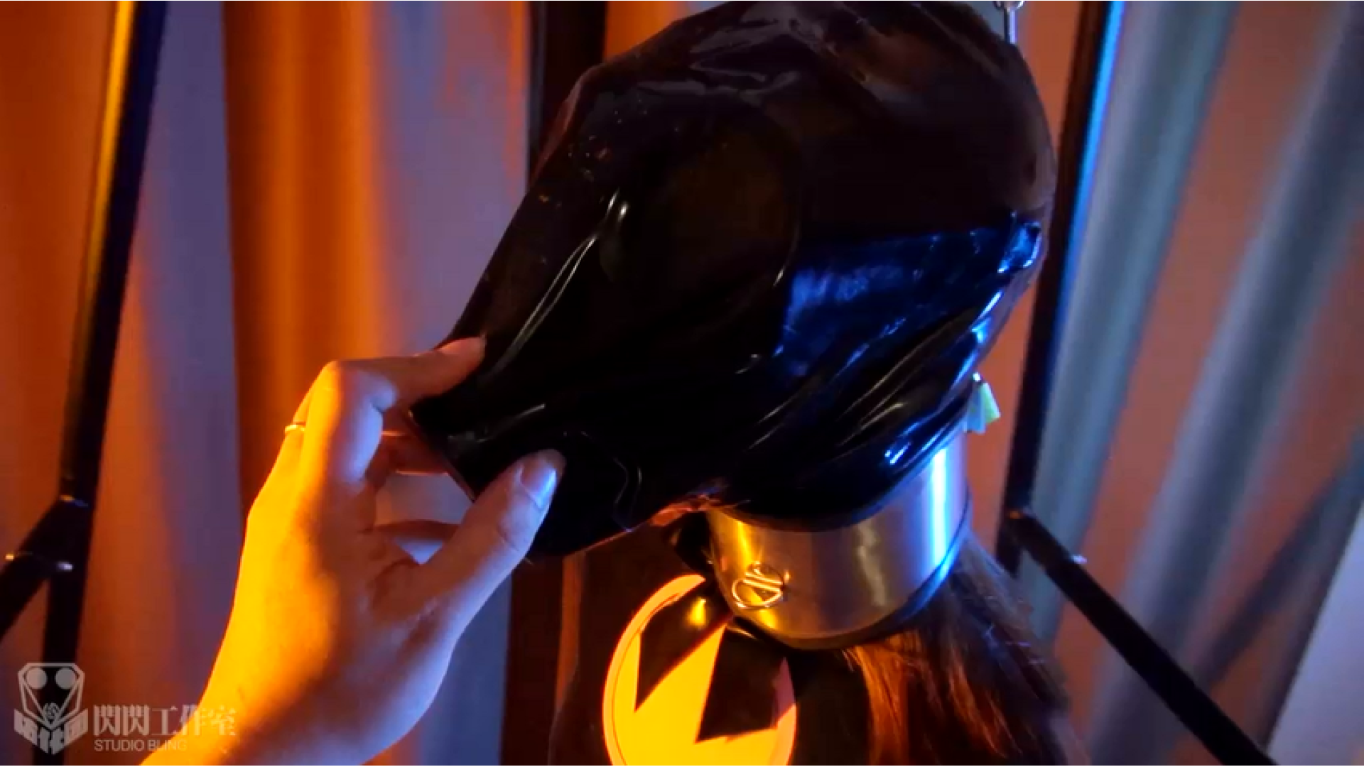 バニーがガスマスクを着用した後、私は反自主的的にラテックスの呼吸制御用フードを上に置きました。