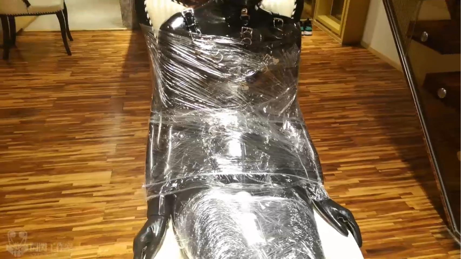 ラップで包んでMちゃんを縛り、振動おもちゃを太ももに固定します。