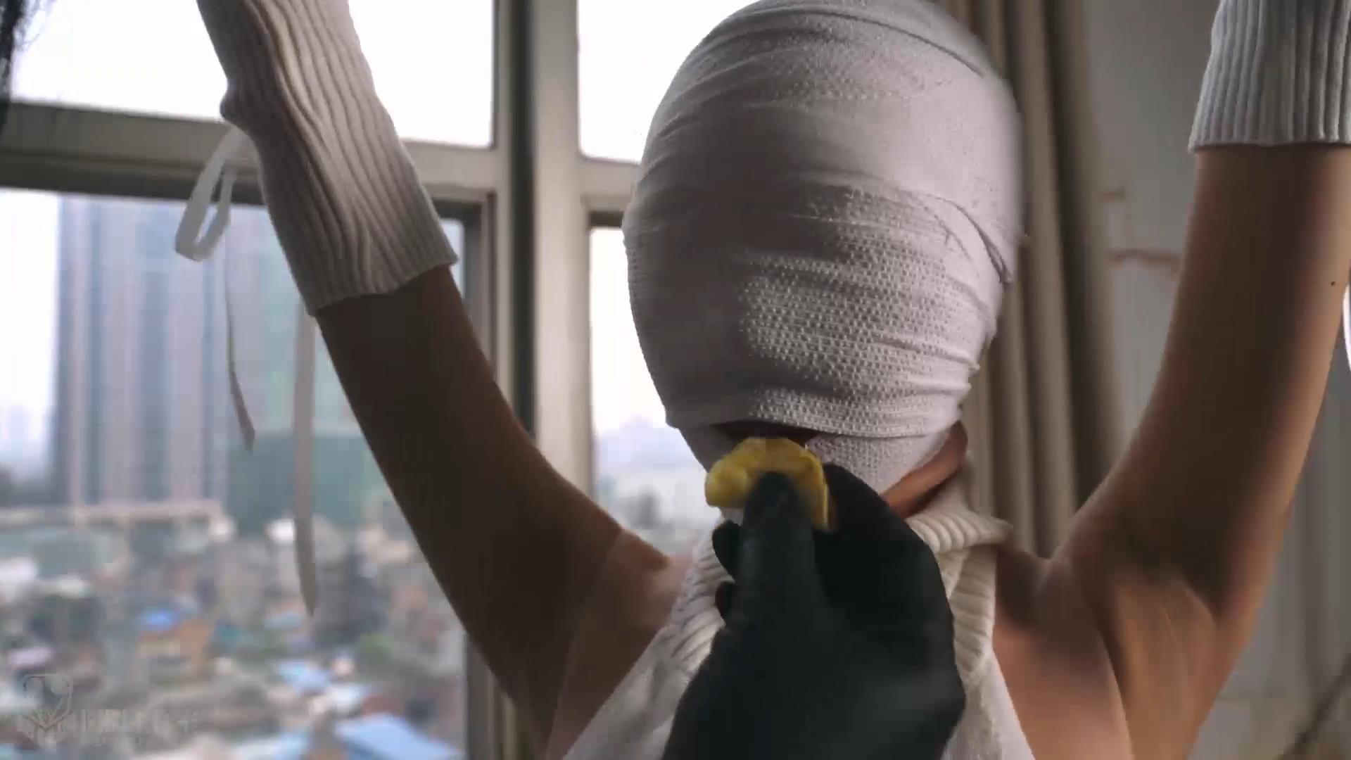 葵ちゃんの頭を包帯で包み、首枷をはめ、両手をつり上げる