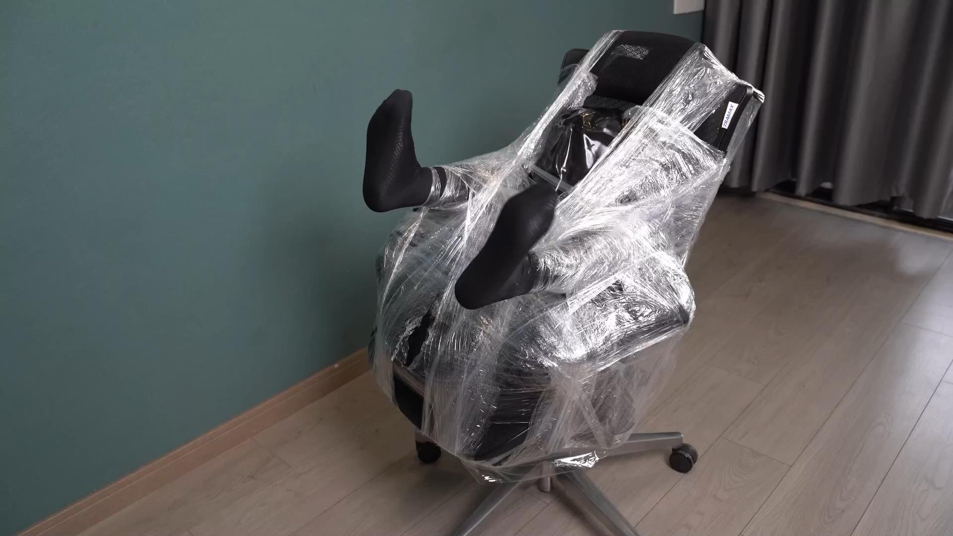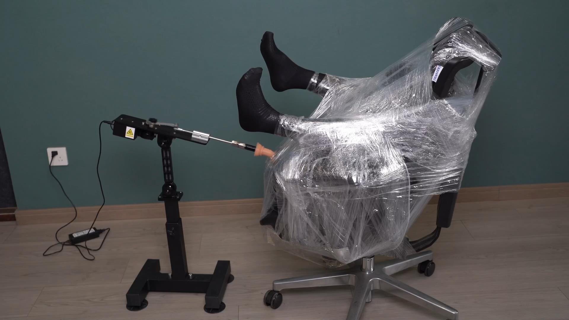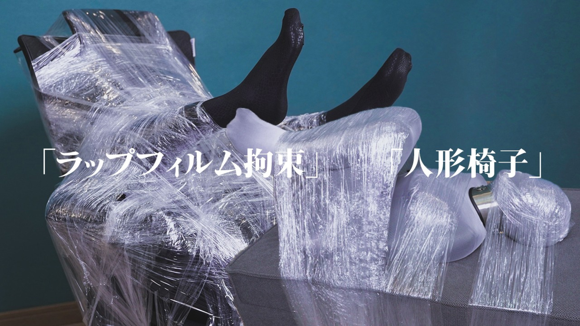 即興で彼女を人形椅子にしてみた。マシンの利便性のために、今回は彼女の両脚を上に折り曲げ、狂ったようにラップフィルムを彼女と椅子に巻き付けた。