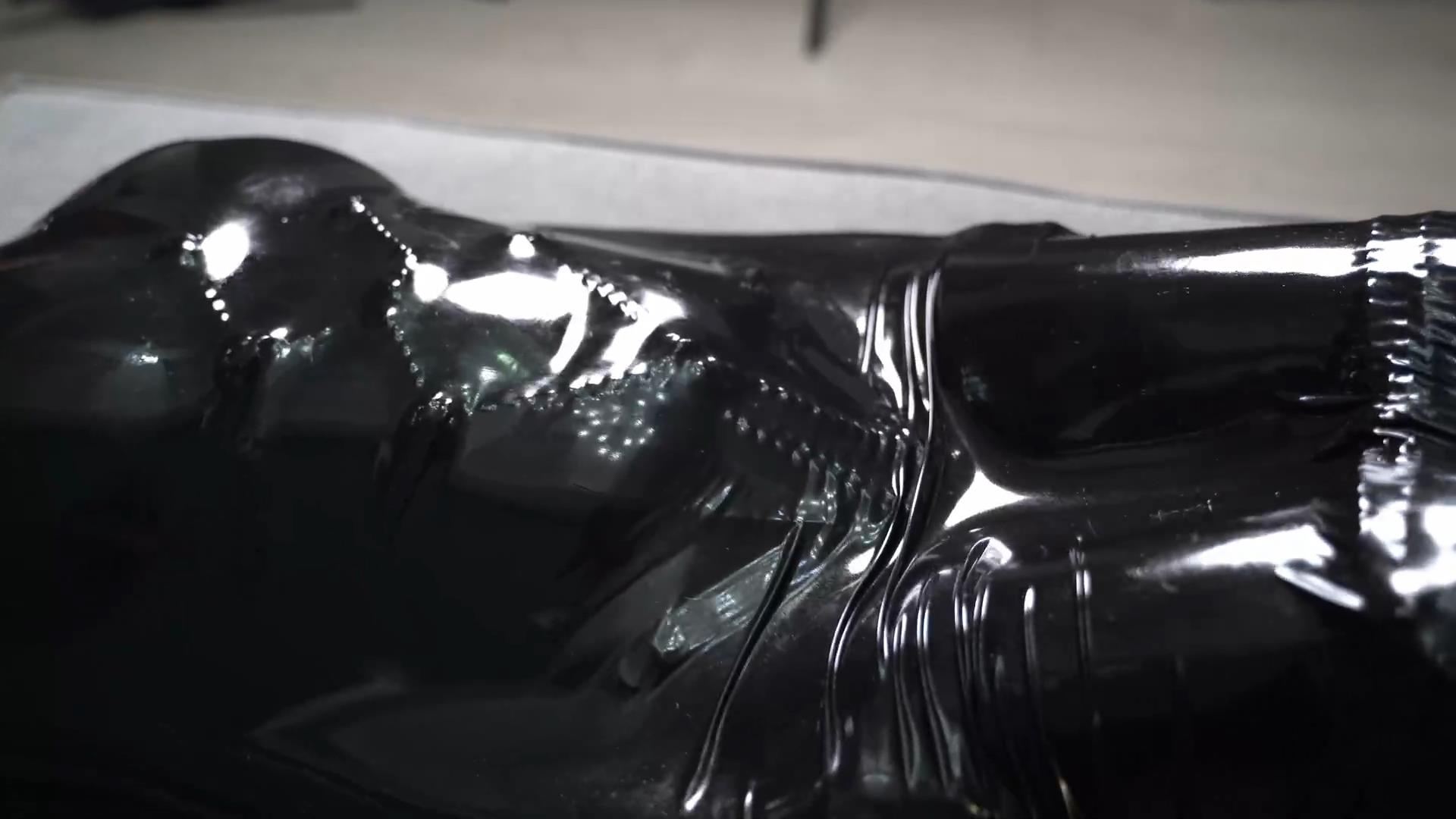 空気が抜かれるにつれ、光沢のある黒いラテックス表面に体と麻縄の輪郭が現れ、ますます鮮明になったが、薄いラテックスの層で隔てられているような曖昧さもあった。
