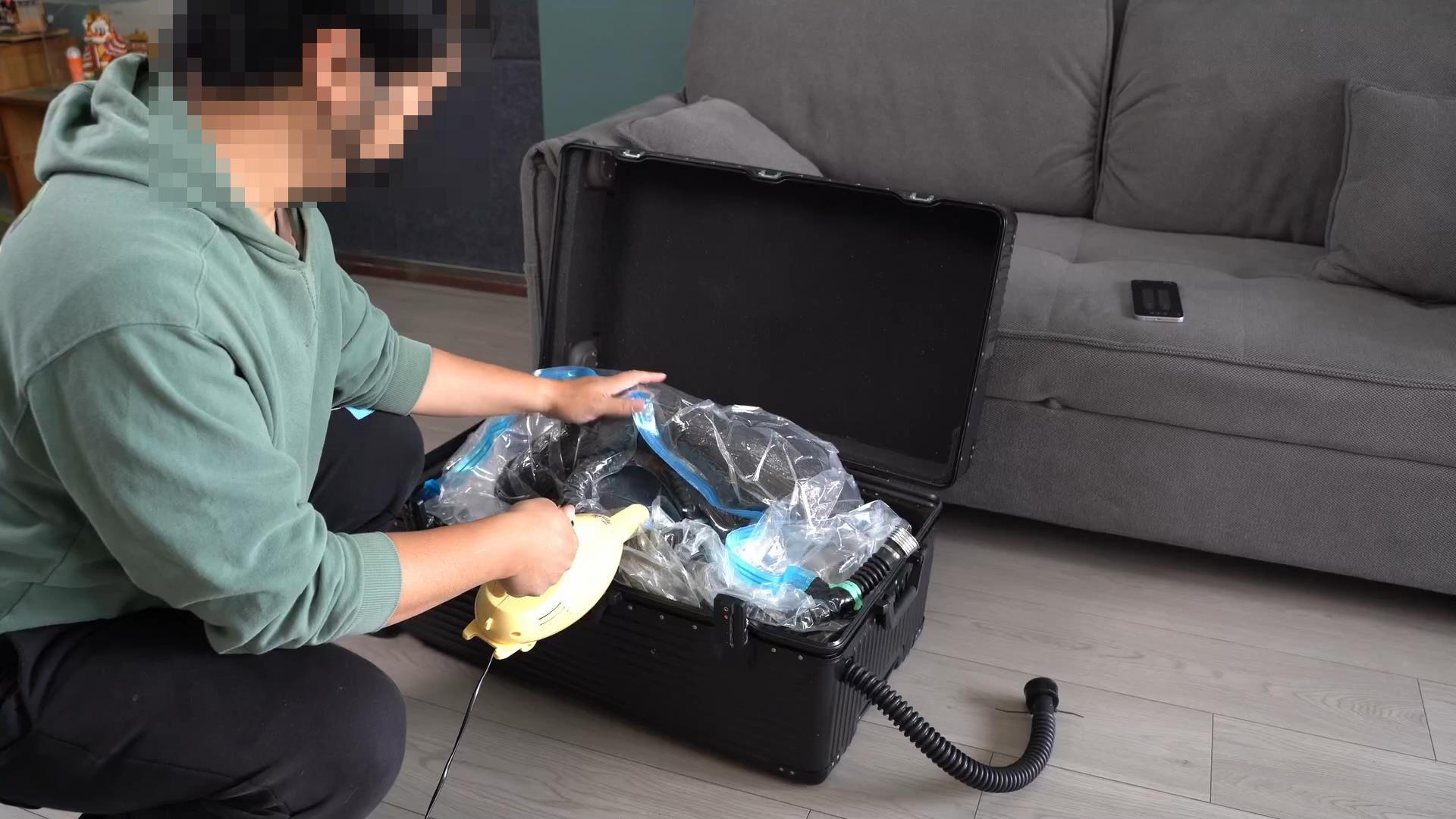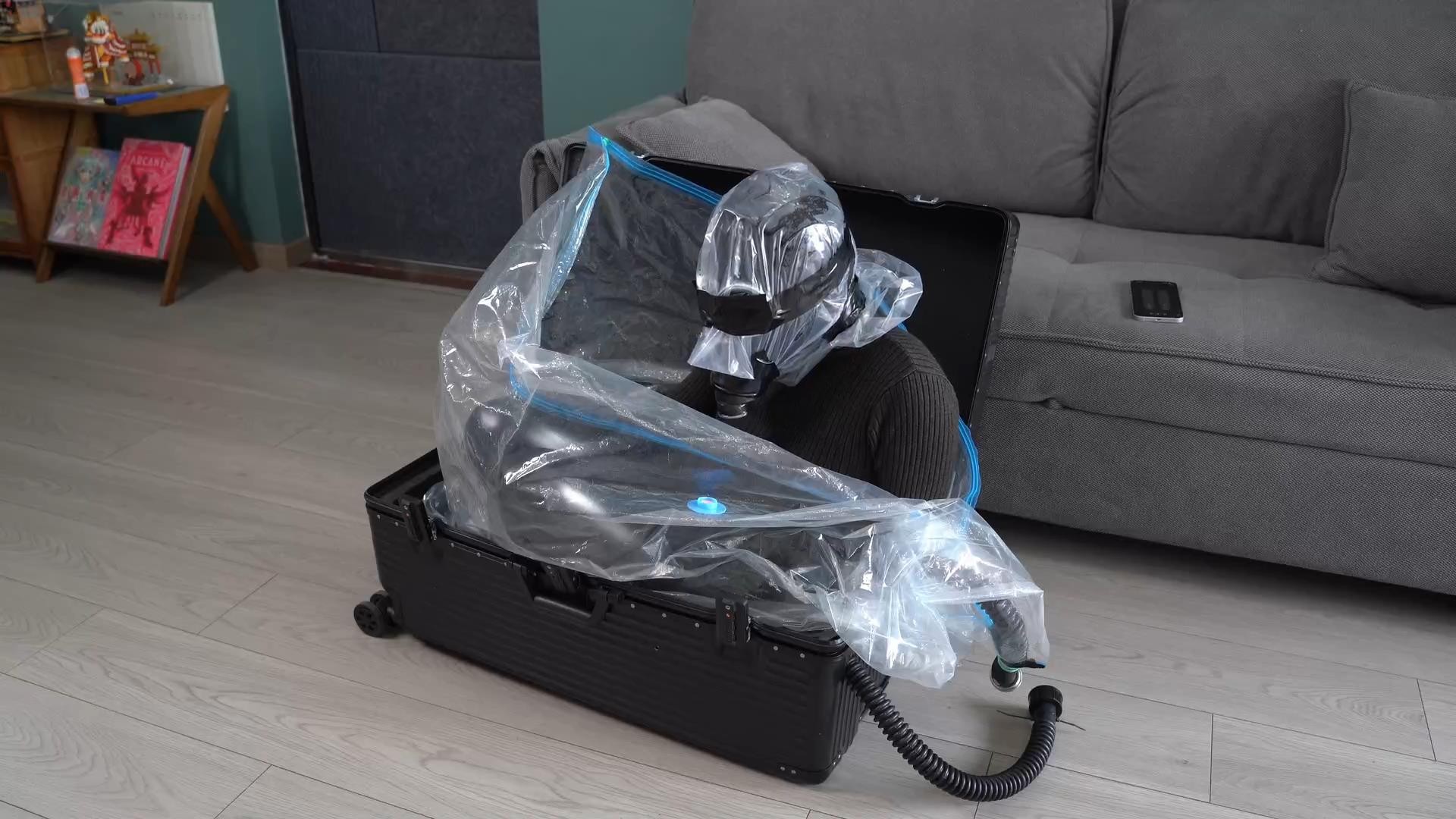 時雨が「真空袋に入れられて箱に詰められるのを試してみたい」と言ったので、「どれくらい持てそう?」と聞いたら「1時間」と答えた。言うは易く行うは難し。真空袋内で呼吸を維持するため、時雨に単方向の防毒面具を装着させ、さらに頭部をプラスチック袋でぴったり覆って厳重に密封し、面具の縁から空気が入らないようにした。真空袋と呼吸管も徹底的に密閉し、最後にランディングゴム(ラテックスコーキング)で隙間を一度埋めた。彼女を箱に詰めた後、体内に入っている振動玩具をオンにして、「しっかり中で楽しんでね」と放置。防毒面具の呼吸管は外まで延長——当然、そこに私がさらに道具を追加する余地が生まれる。最後は電制呼吸バルブをランダムモードに設定し、箱を雑物房に押し込んで部屋を出た。カメラは私のタブレットに投映されている。外で仕事を続けながら、時雨の呼吸音をリアルタイムで監視していた。およそ30分後、モニターから時雨の鋭い叫び声が聞こえてきたので、ようやく戻って解放した。残念ながら、彼女をリビングまで運び出す際に誤ってカメラに触れてしまい、箱を開けて時雨を出したシーンは録画できなかった。