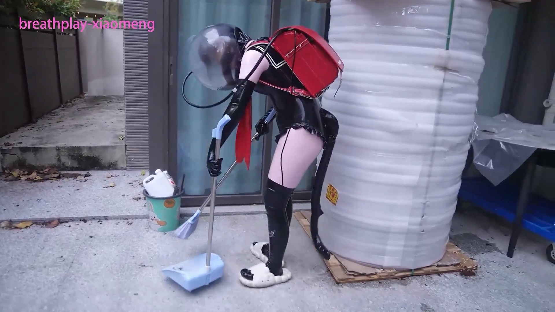 呼吸問題を解決するため、私は吸排気一体型のエアーポンプを用意し、ホースを繋いで彼女のバックパックに忍ばせました。ヘルメット内の酸素が少なくなったら、ポンプを起動して吸気と排気を数回切り替えるだけで、二酸化炭素を追い出し、新鮮な空気を補充できる仕組みです。唯一の難点は、このポンプにバッテリーがなくコンセントが必要なこと。掃除の合間に、小萌ちゃんが喘ぎながらコンセントの場所まで駆け寄り、自分を「プラグイン」してリモコンで換気する姿は……まるでバッテリーが劣化したアンドロイドメイドが、頻繁に充電ステーションに戻らなければならないようで、なんとも滑稽で面白い光景でした。